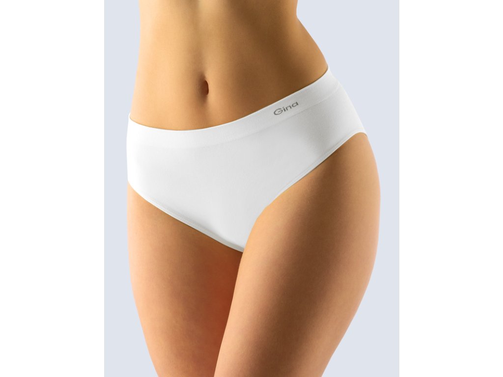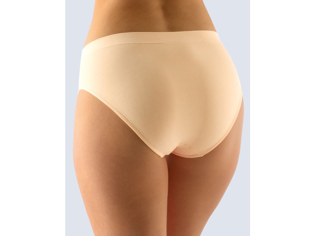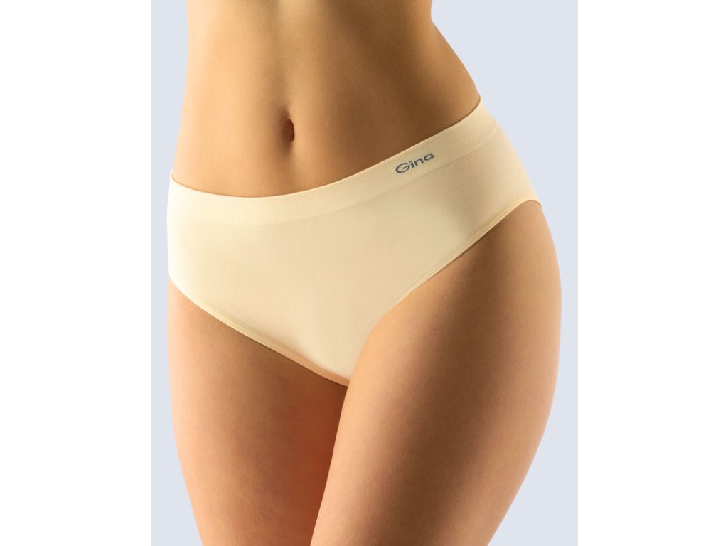Kalhotky klasického střihu se širším bokem, dámské bezešvé prádlo. Pasový kraj je zesílený a zapravený bezešvým způsobem. V nohavičkách je zašitá úzká pruženka. Kalhotky jsou jednobarevné. V záložce je vypletené logo v šedé barvě.