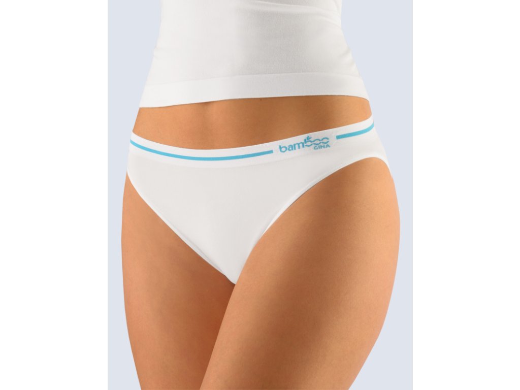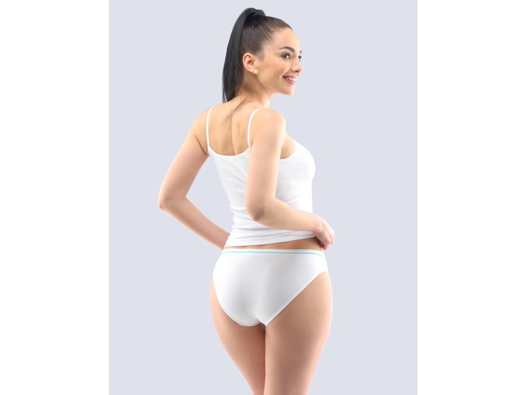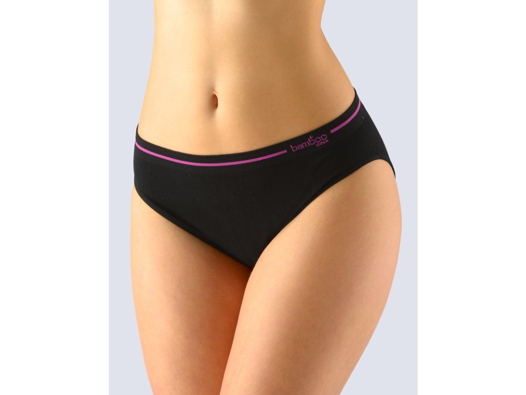 Kalhotky klasického střihu s úzkým bokem, dámské bezešvé prádlo. Pasový kraj je zesílený a zapravený bezešvým způsobem. V nohavičkách je zašitá úzká pruženka. Kalhotky jsou jednobarevné. V záložce je vypletený barevný proužek a logo.