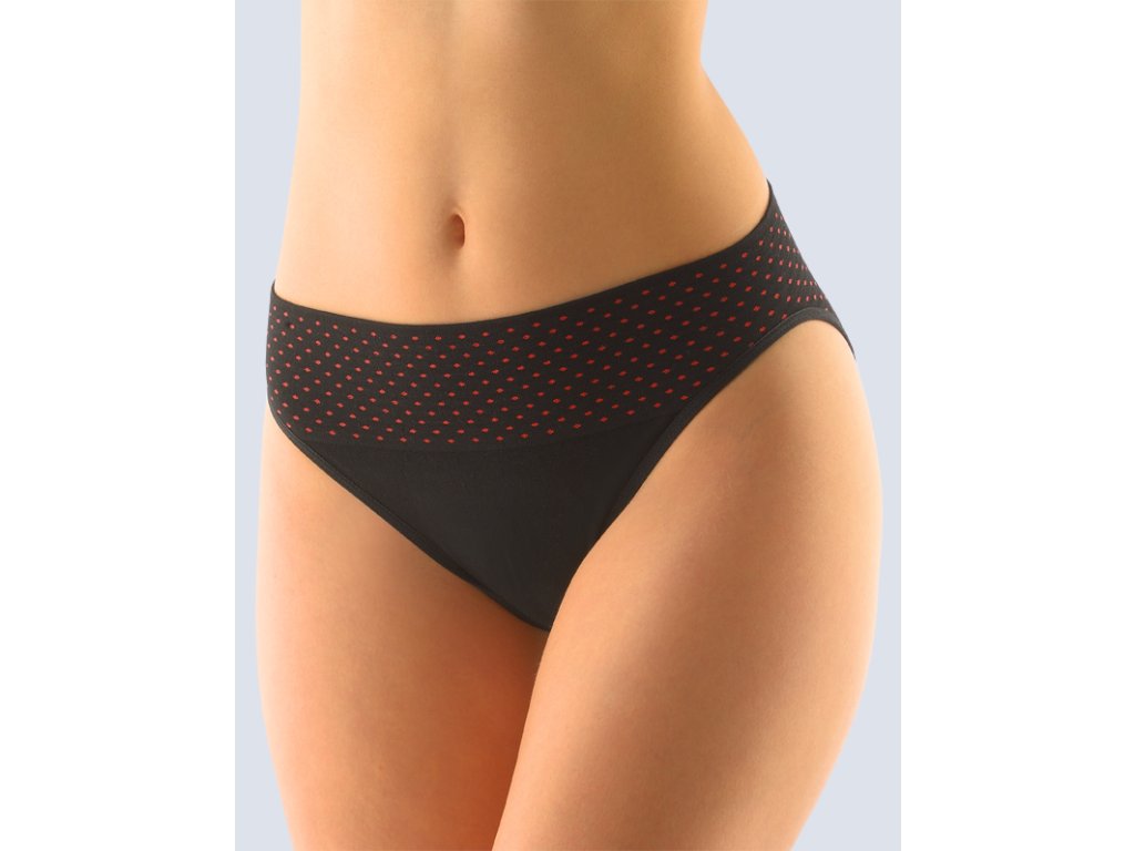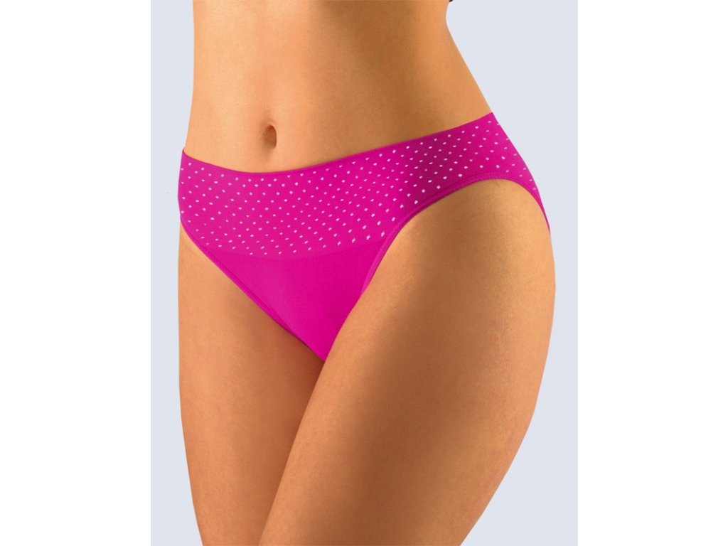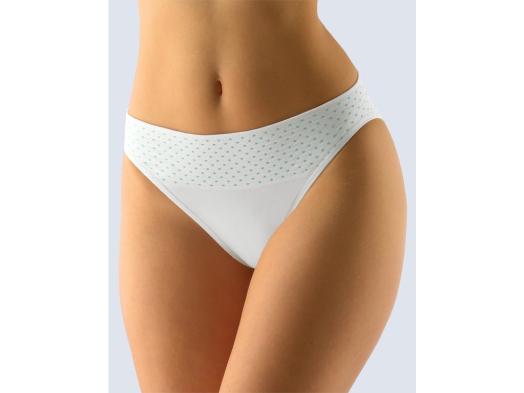 Kalhotky klasického střihu s úzkým bokem a širokou pasovou záložkou, dámské bezešvé prádlo. Pasový kraj je zesílený a zapravený bezešvým způsobem. Nohavičky jsou začištěné lemovacími proužky. Kalhotky jsou jednobarevné. V záložce jsou vypletené drobné tečky.