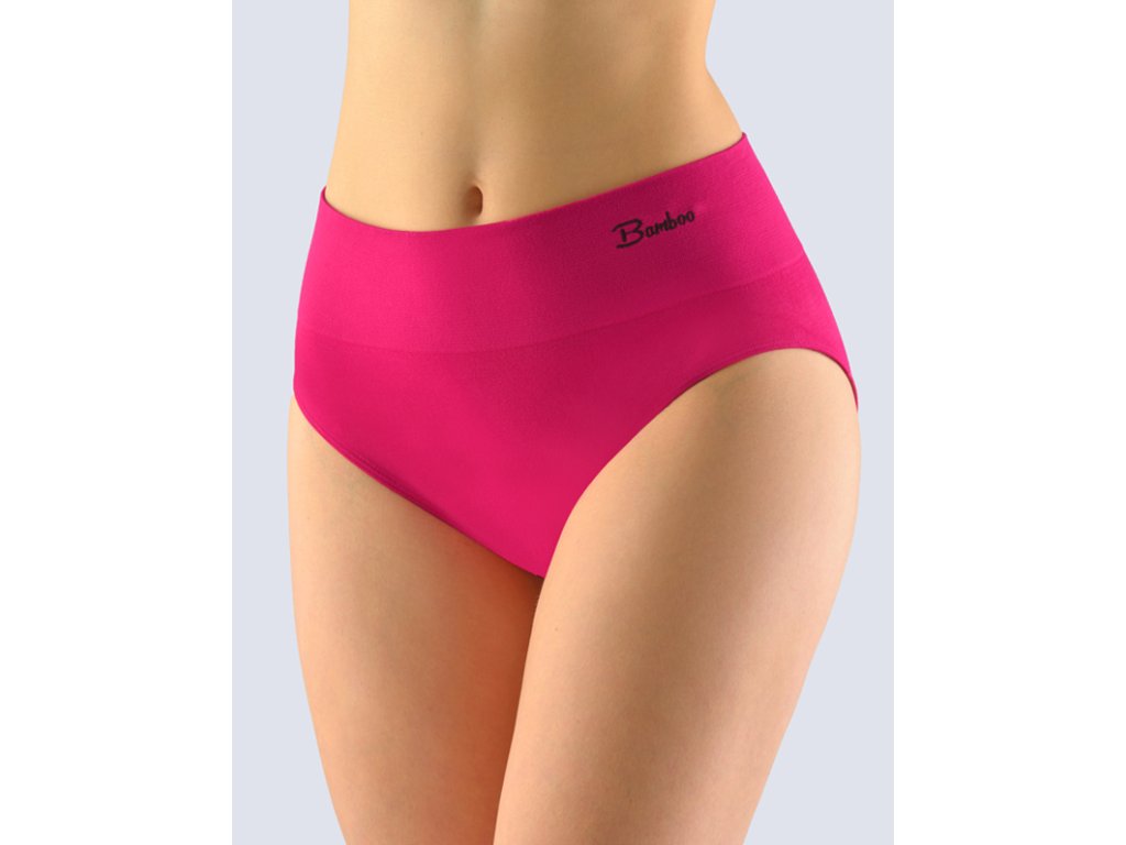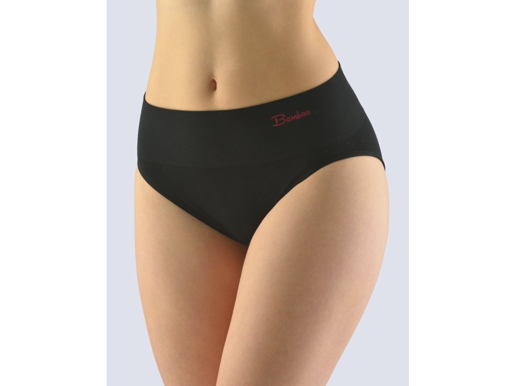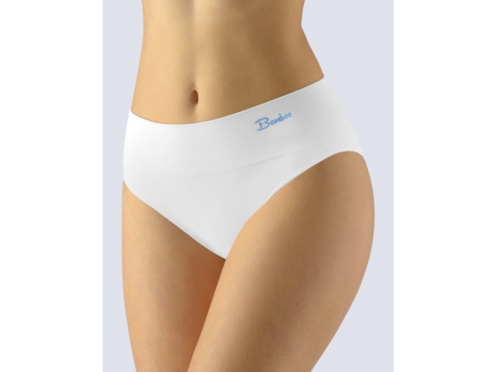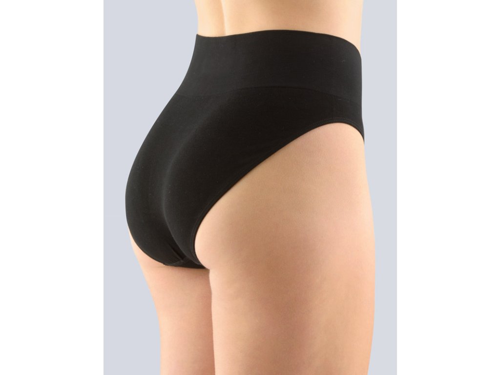 Kalhotky klasického střihu se širokým bokem a širokou pasovou záložkou, dámské bezešvé prádlo. Pasový kraj je zesílený a zapravený bezešvým způsobem. V nohavičkách je zašitá úzká pruženka. Kalhotky jsou jednobarevné. V záložce je vypletené barevné logo.