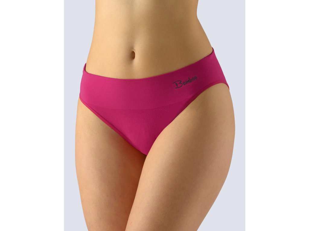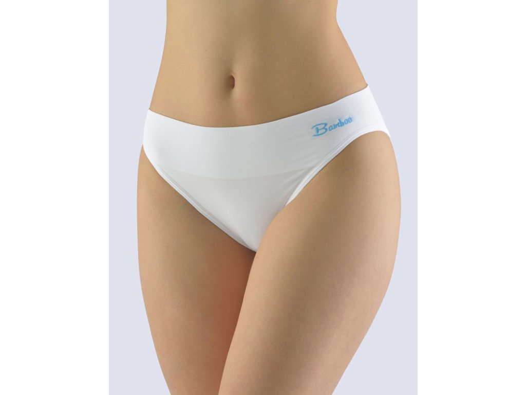 Kalhotky klasického střihu s úzkým bokem a širokou pasovou záložkou, dámské bezešvé prádlo. Pasový kraj je zesílený a zapravený bezešvým způsobem. Nohavičky jsou začištěné lemovacími proužky. Kalhotky jsou jednobarevné. V záložce je vypletené barevné logo.