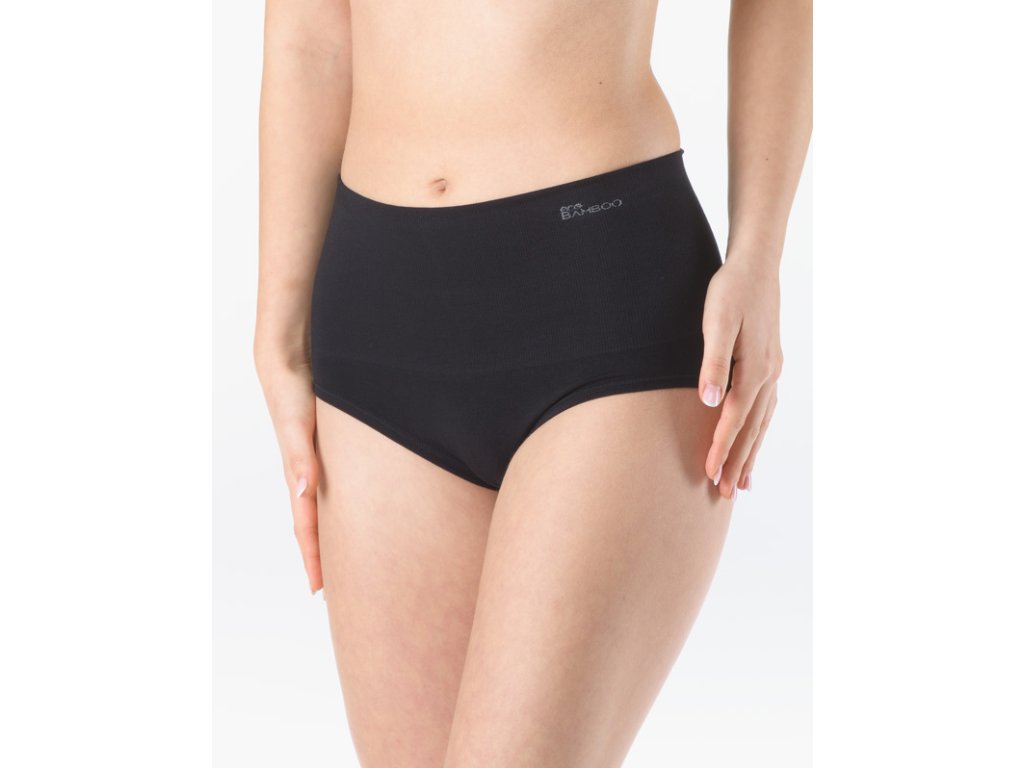Kalhotky klasického střihu vyšší se širokým bokem a širkou pasovou záložkou, dámské bezešvé prádlo. Pasový kraj je zesílený a zapravený bezešvým způsobem. Nohavičky jsou začištěné podehnutím. Kalhotky jsou jednobarevné. V pasové záložce je vypletené logo.