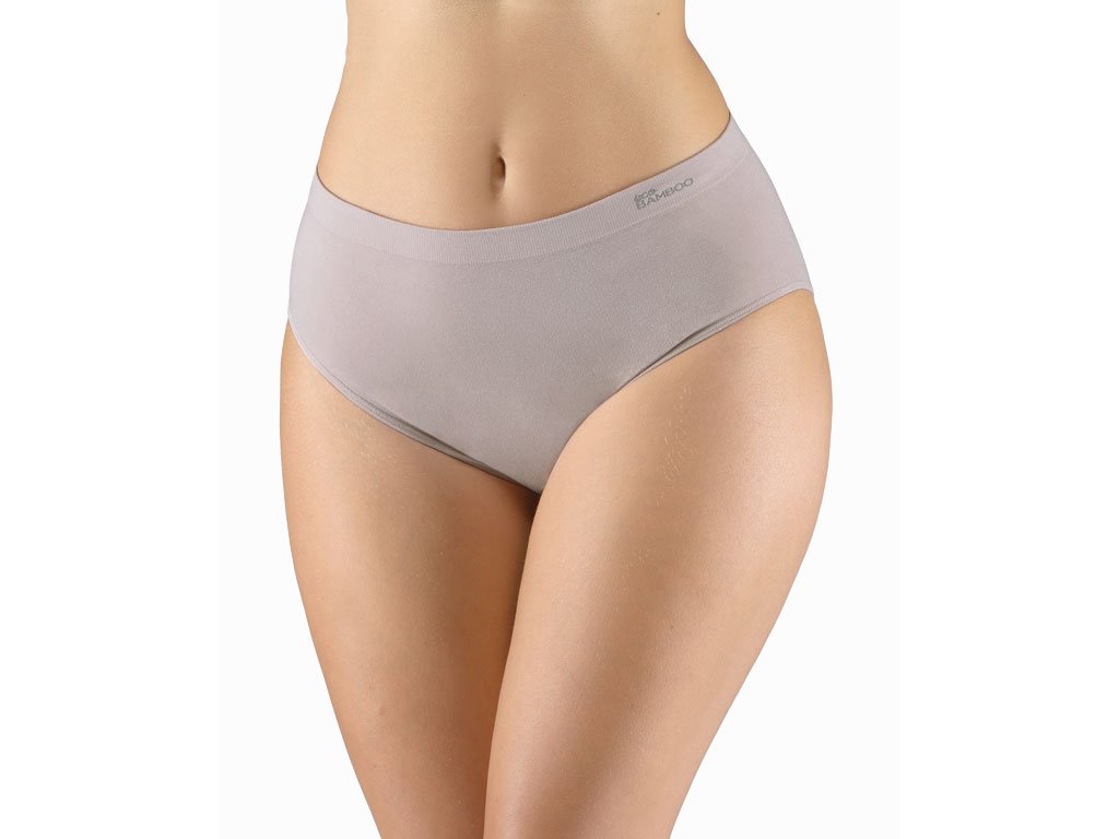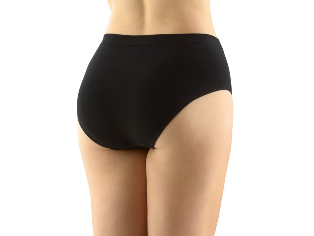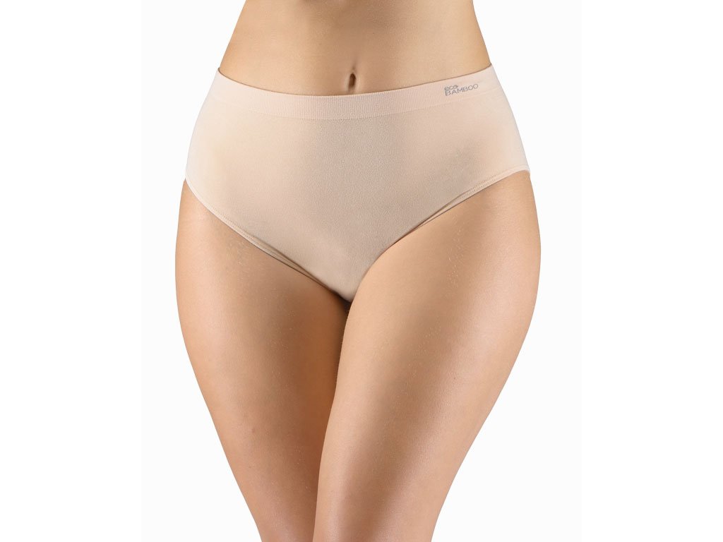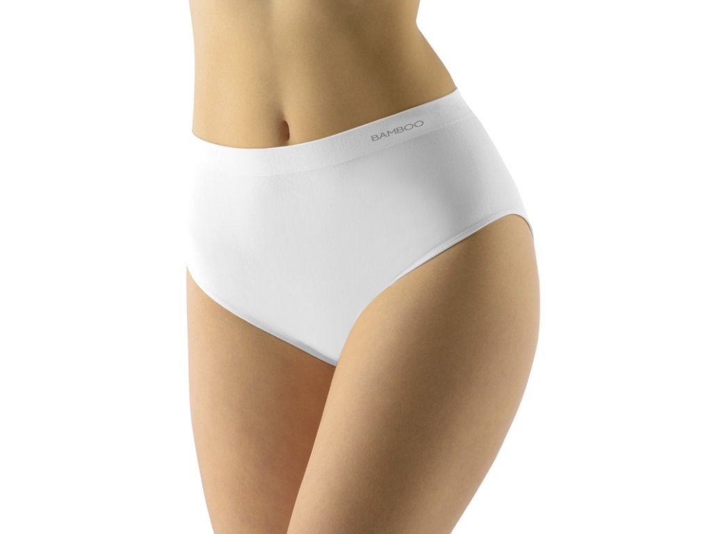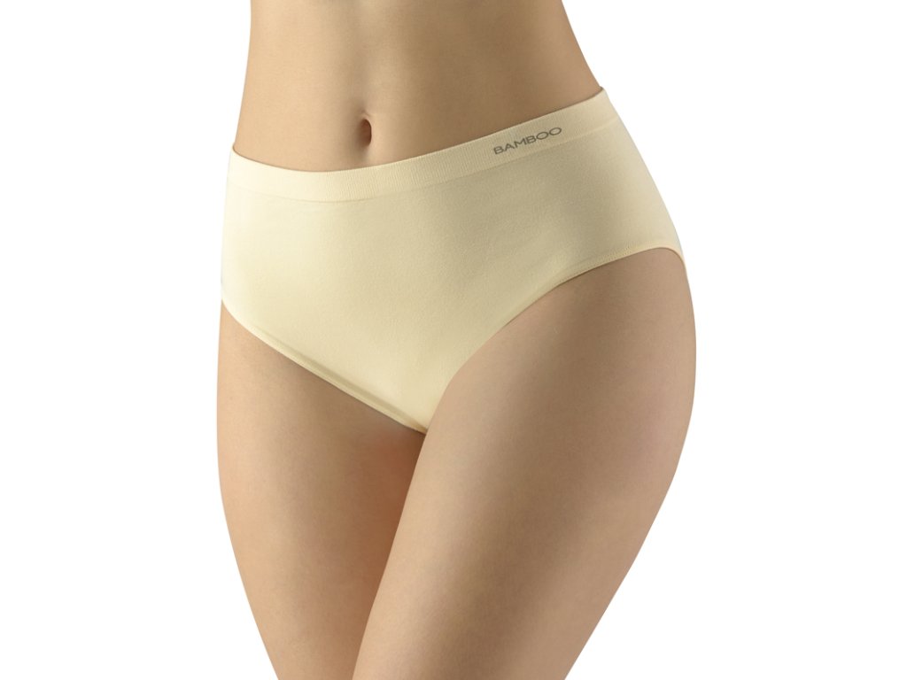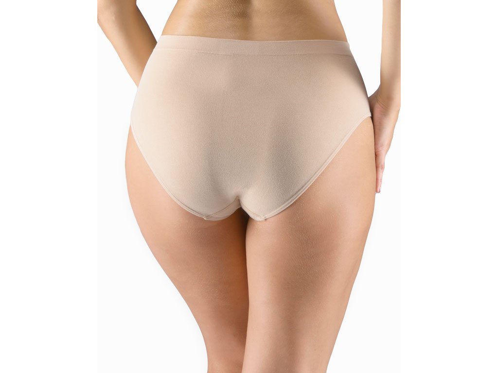 Kalhotky klasického střihu se širším bokem ve větších velikostech, dámské bezešvé prádlo. Pasový kraj je zesílený a zapravený bezešvým způsobem. V nohavičkách je zašitá úzká pruženka. Kalhotky jsou jednobarevné. V záložce je vypletené logo.