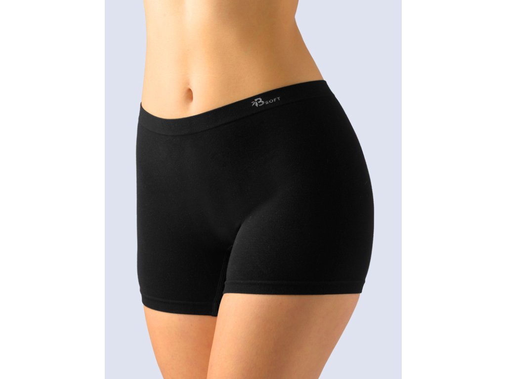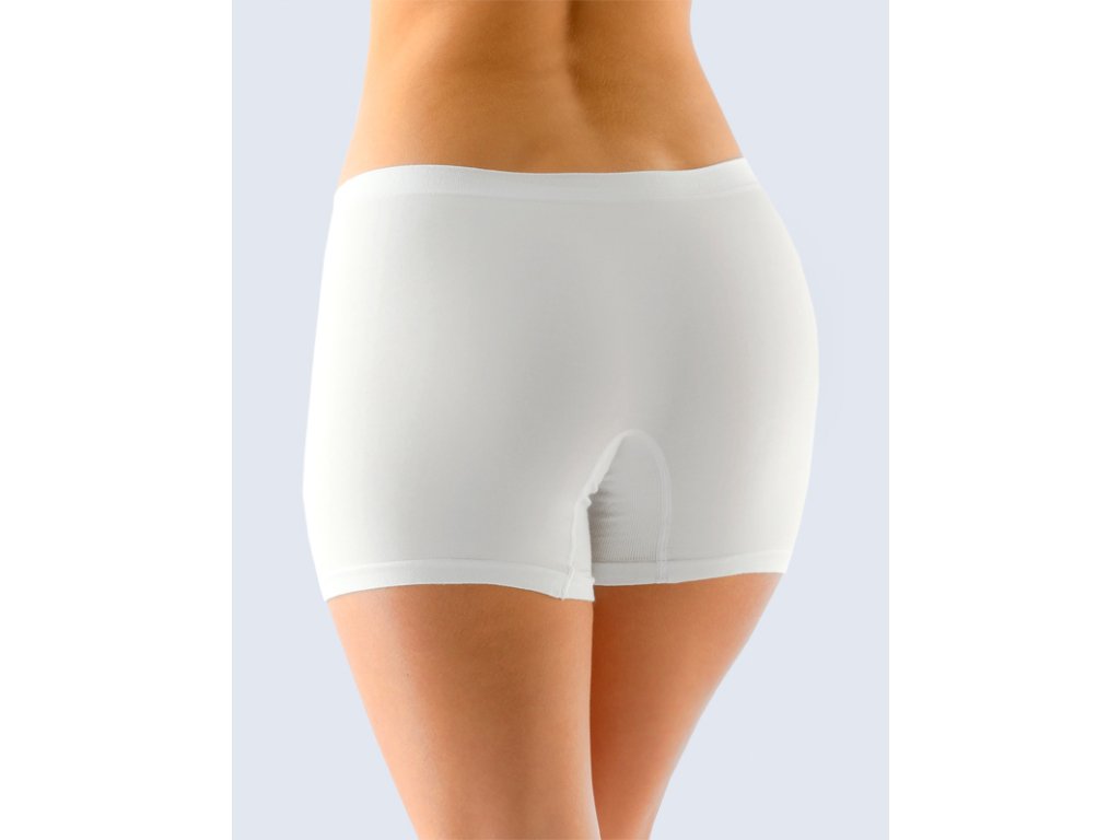 Kalhotky s delší nohavičkou, boxerky, dámské bezešvé prádlo. Pasový kraj je zesílený a zapravený bezešvým způsobem. Nohavičky jsou zapravené bezešvým způsobem. V rozkroku je všitý klínek. Kalhotky jsou jednobarevné. V záložce je vypletené logo v šedé barvě.