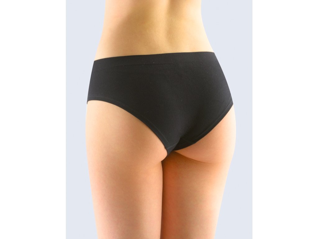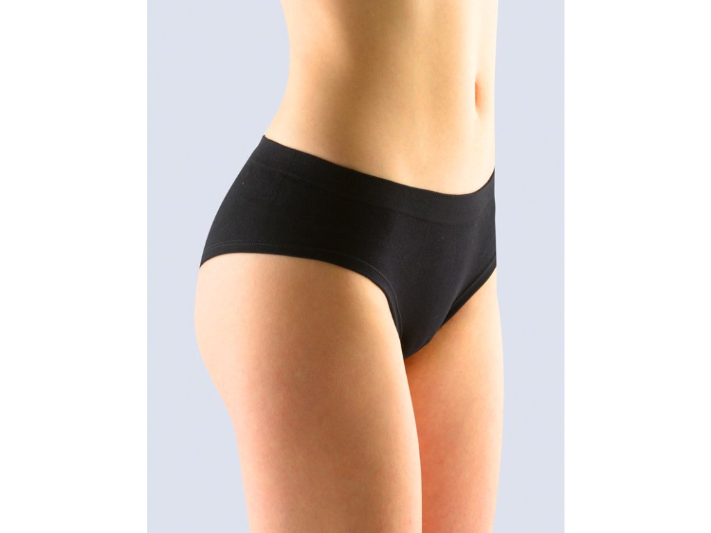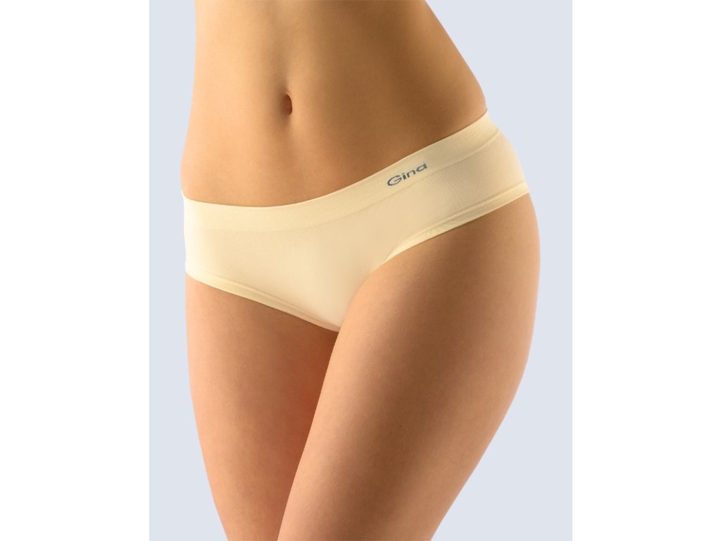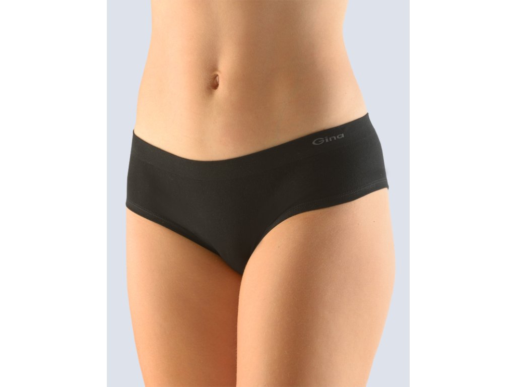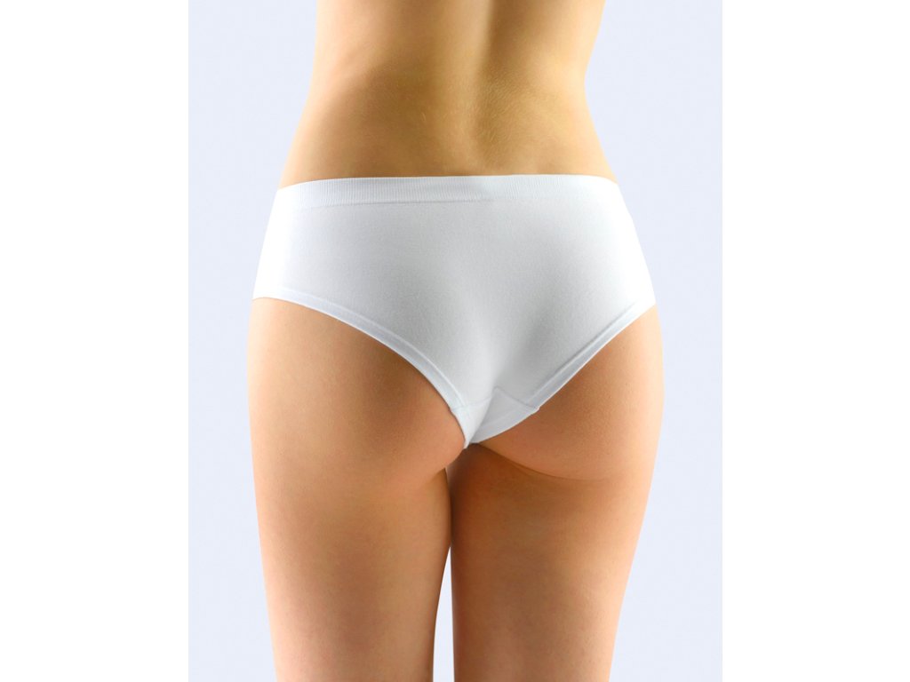 Bokové kalhotky francouzského střihu se širokým bokem, dámské bezešvé prádlo. Pasový kraj je zesílený a zapravený bezešvým způsobem. Nohavičky jsou začištěné podehnutím. Kalhotky jsou jednobarevné. V záložce je vypletené logo v šedé barvě.