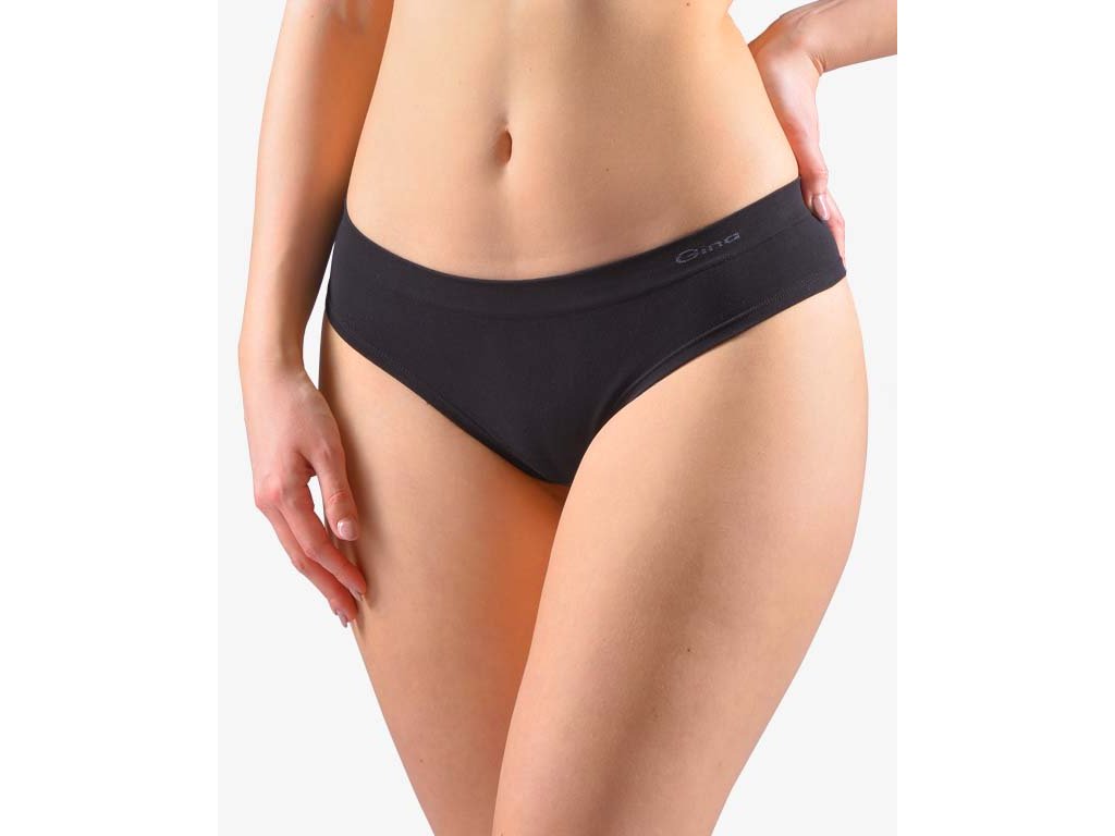 Boková tanga francouzského střihu se širokým bokem, dámské bezešvé prádlo. Pasový kraj je zesílený a zapravený bezešvým způsobem. Nohavičky jsou začištěné podehnutím. Kalhotky jsou jednobarevné. V záložce je vypletené logo v šedé barvě.
