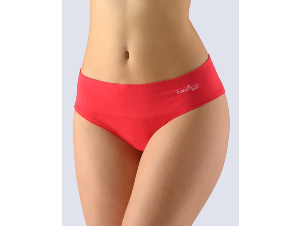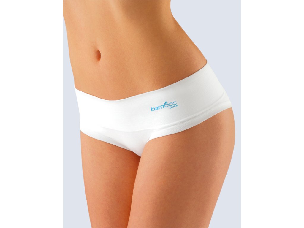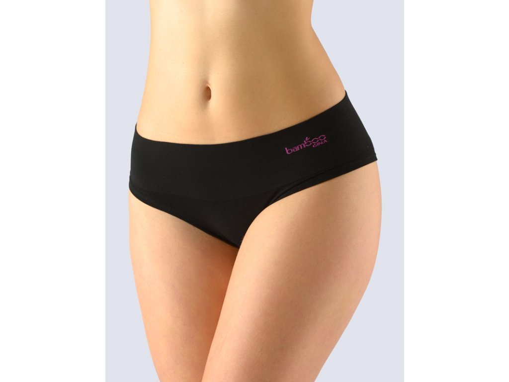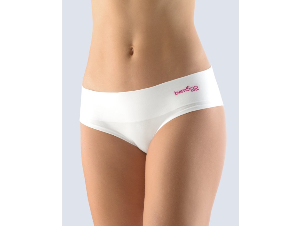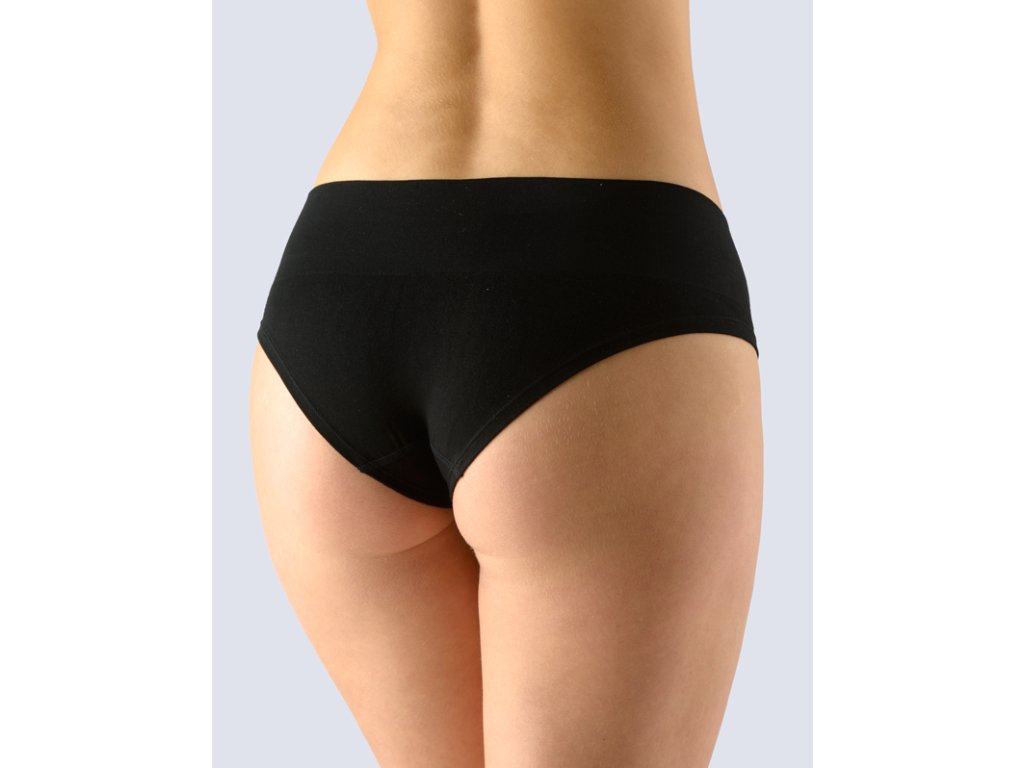 Bokové kalhotky francouzského střihu se širokým bokem a širokou pasovou záložkou, dámské bezešvé prádlo. Pasový kraj je zesílený a zapravený bezešvým způsobem. Nohavičky jsou začištěné podehnutím. Kalhotky jsou jednobarevné. V záložce je vypletené barevné logo.