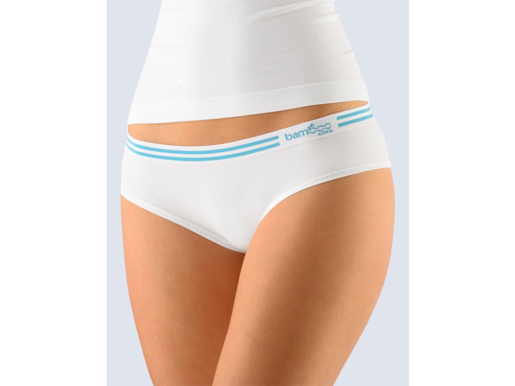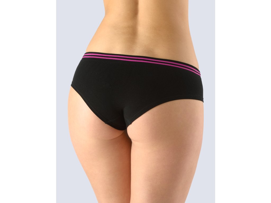 Bokové kalhotky francouzského střihu se širokým bokem, dámské bezešvé prádlo. Pasový kraj je zesílený a zapravený bezešvým způsobem. Nohavičky jsou začištěné podehnutím. Kalhotky jsou jednobarevné. V záložce jsou vypletené dva barevné proužky a logo.