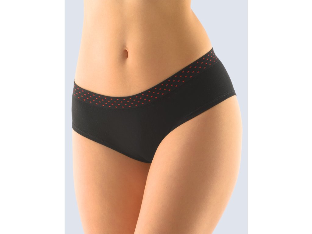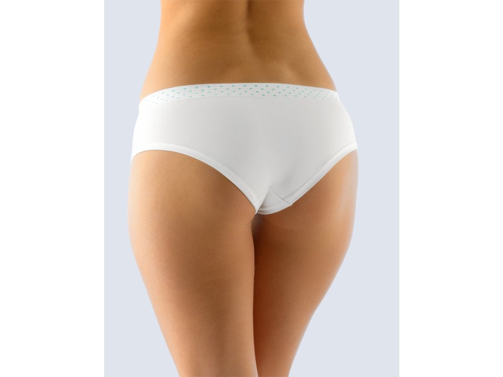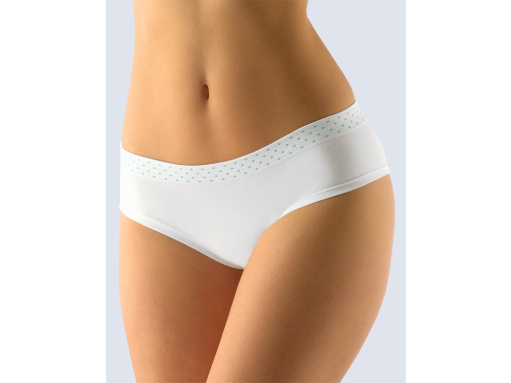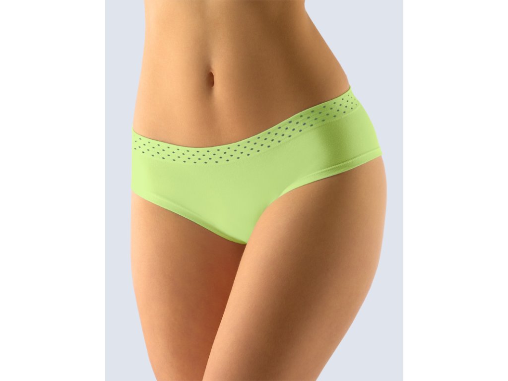 Bokové kalhotky francouzského střihu se širokým bokem, dámské bezešvé prádlo. Pasový kraj je zesílený a zapravený bezešvým způsobem. Nohavičky jsou začištěné podehnutím. Kalhotky jsou jednobarevné. V záložce jsou vypletené drobné tečky.