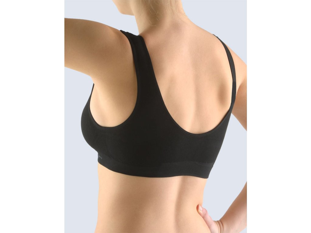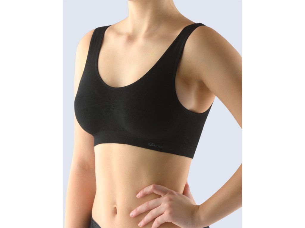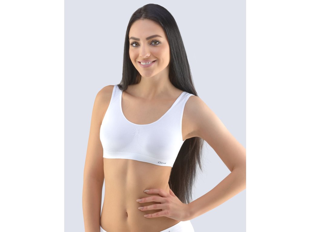 Podprsenkový top se širšími ramínky, dámské bezešvé prádlo. Dolní kraj je zesílený a zapravený bezešvým způsobem. V průramcích a průkrčníku je zašitá úzká pruženka. Podprsenka je jednobarevná. V záložce je vypletené logo v šedé barvě.