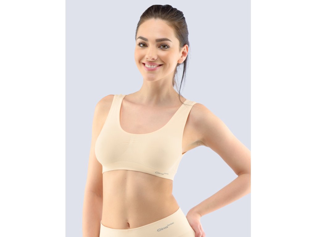 Podprsenkový top se širšími ramínky, dámské bezešvé prádlo. Dolní kraj je zesílený a zapravený bezešvým způsobem. V průramcích a průkrčníku je zašitá úzká pruženka. Podprsenka je jednobarevná. V záložce je vypletené logo v šedé barvě.