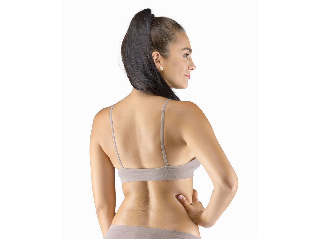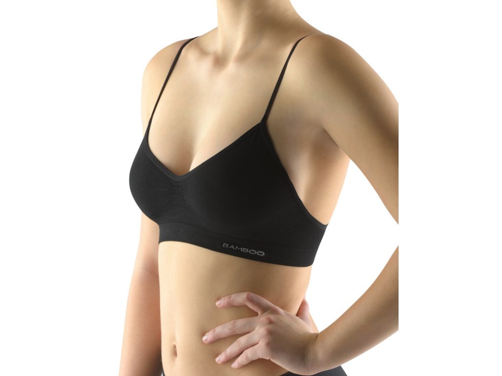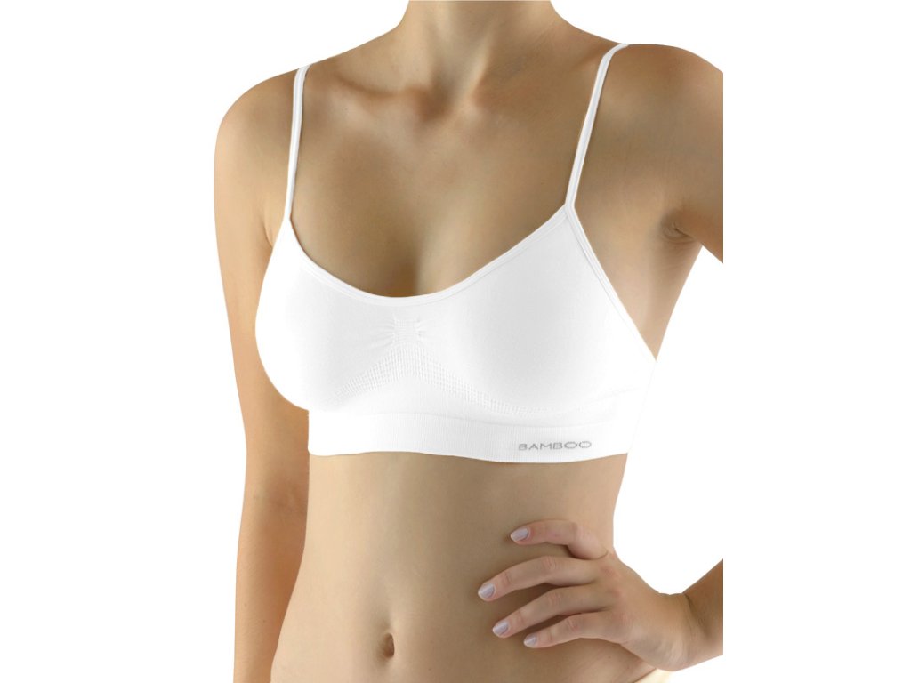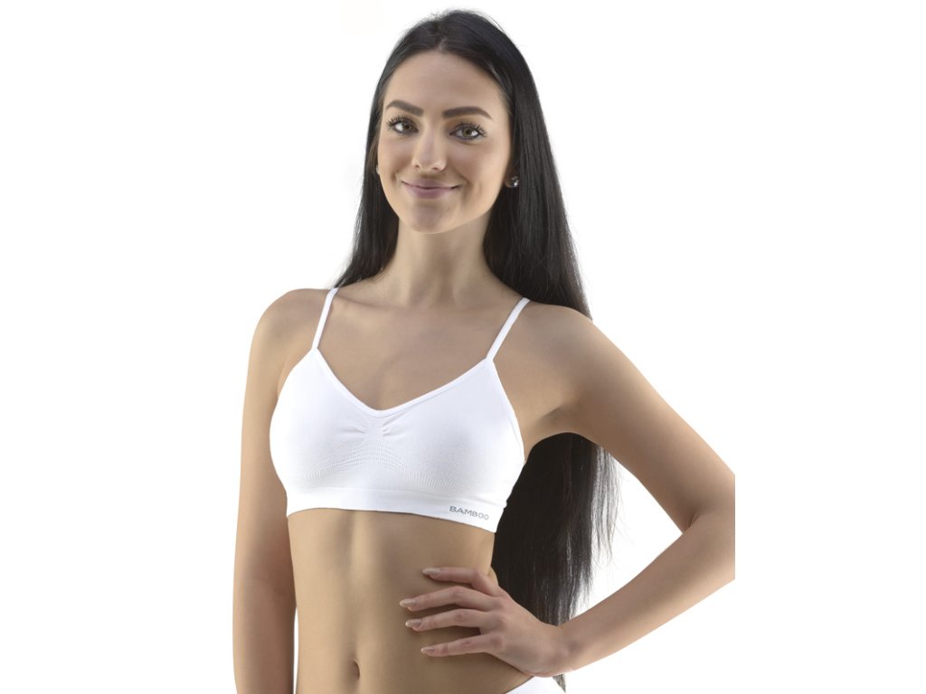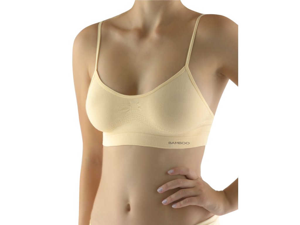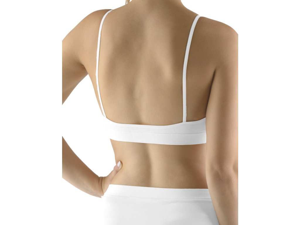 Podprsenkový top s úzkými ramínky, dámské bezešvé prádlo. Dolní kraj je zesílený a zapravený bezešvým způsobem. Průramky a průkrčník jsou začištěny lemovacími proužky, které přechází do ramínek. Top je jednobarevný. V záložce je vypletené logo.