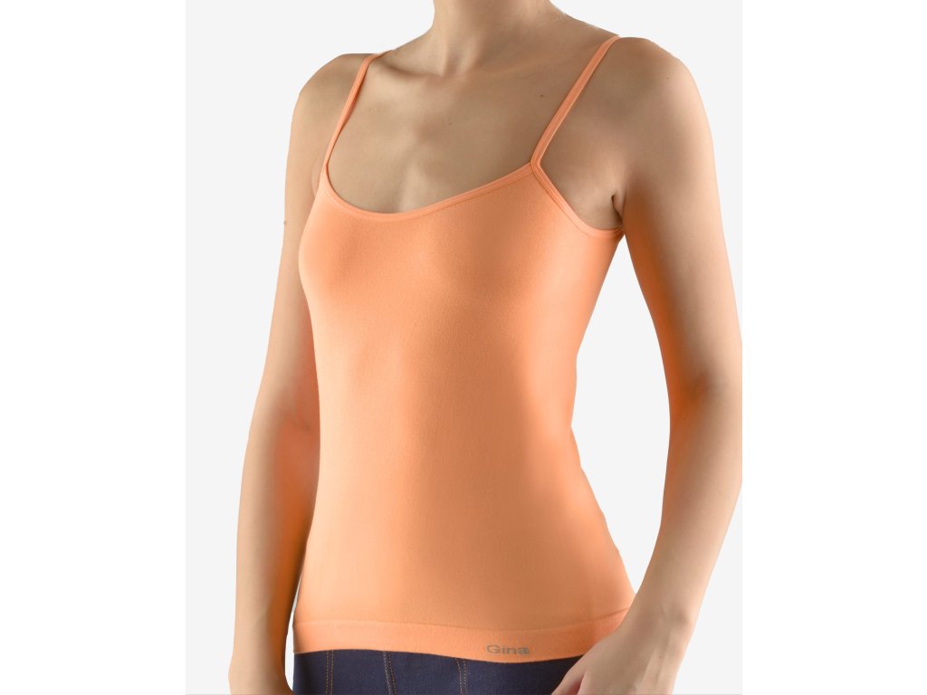 Košilka s úzkými ramínky, dámské bezešvé prádlo. Dolní kraj je zapravený bezešvým způsobem. Průramky a průkrčník jsou začištěny lemovacími proužky, které přechází do ramínek. Košilka je jednobarevná. V záložce je vypletené logo v šedé barvě. Materiál je vyroben z polyamidového vlákna, které je doplněno elastanem. Elastan přidává materiálu pružnost a zlepšuje jeho tvarovou stálost. Materiál se vyznačuje velmi dobrou odolností a trvanlivostí barev.