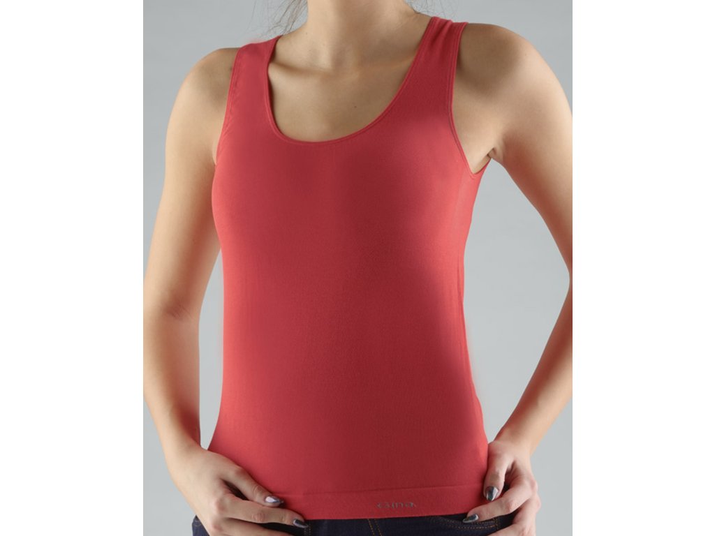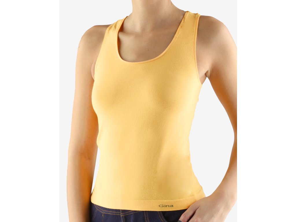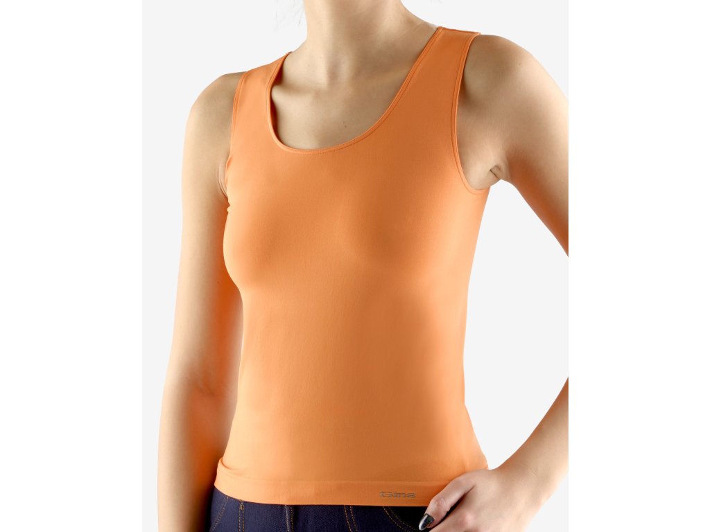 Tílko se širšími ramínky, dámské bezešvé prádlo. Dolní kraj je zapravený bezešvým způsobem. V průramcích a průkrčníku je zašitá úzká pruženka. Tílko je jednobarevné. V záložce je vypletené logo v šedé barvě. Materiál je vyroben z polyamidového vlákna, které je doplněno elastanem. Elastan přidává materiálu pružnost a zlepšuje jeho tvarovou stálost. Materiál se vyznačuje velmi dobrou odolností a trvanlivostí barev.