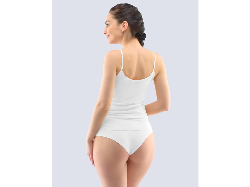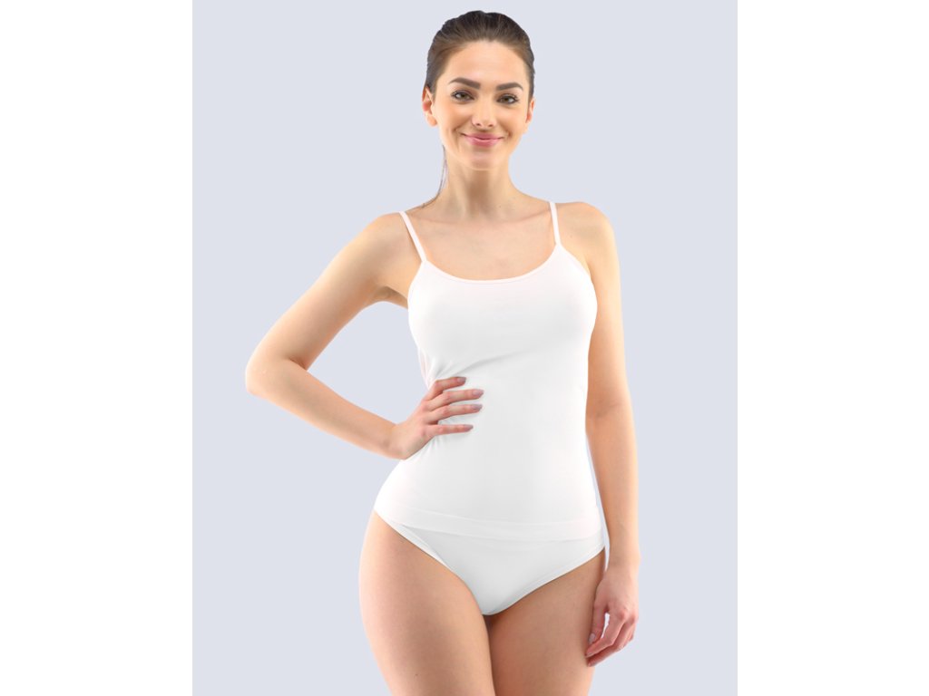 Košilka s úzkými ramínky, dámské bezešvé prádlo. Dolní kraj je zapravený bezešvým způsobem. Průramky a průkrčník jsou začištěny lemovacími proužky, které přechází do ramínek. Košilka je jednobarevná. Je bez loga. Košilka je v prodloužené délce, aby byla vaše záda stále v teple.