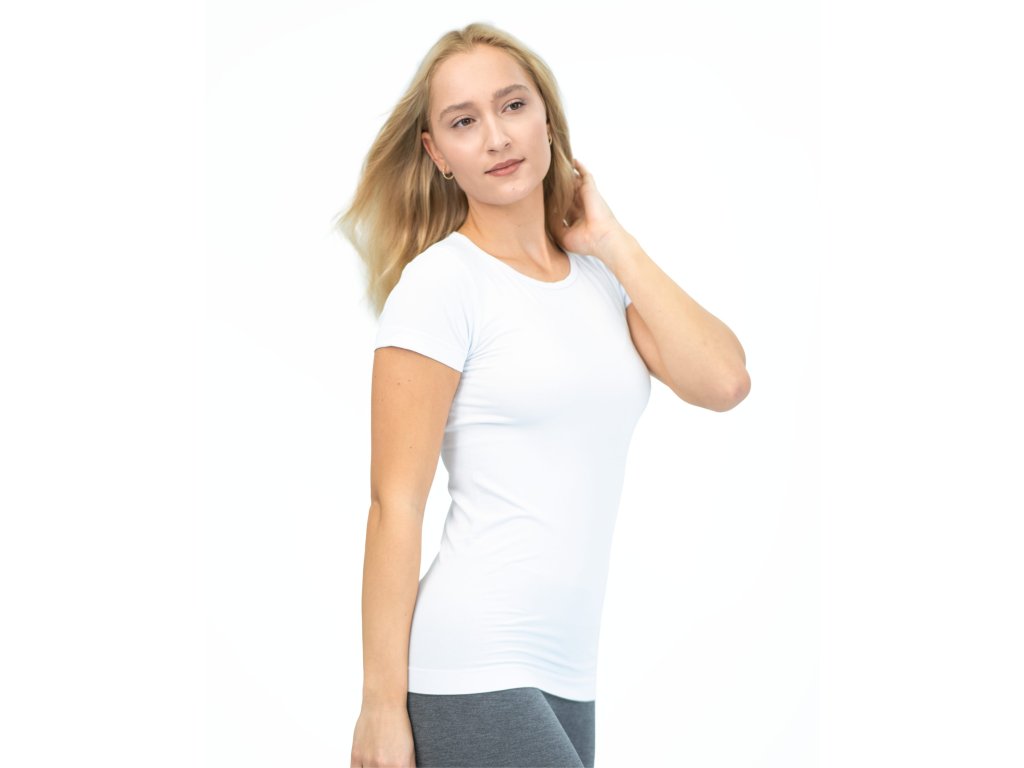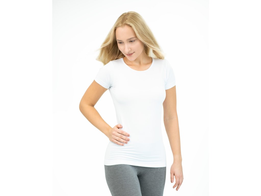 Tričko s krátkým rukávem, dámské bezešvé prádlo. Dolní kraj je zapravený bezešvým způsobem. Průkrčník je začištěný lemovacím proužkem. Tričko je vhodné pro každodenní nošení i sport díky klasicky střiženému kulatému průkrčníku. Tričko je jednobarevné. Je bez loga. Materiál je vyroben z bambusového vlákna, které je doplněno elastanem. Úplet je velmi jemný a příjemný na nošení. Do každodenního prádla přináší luxusní hedvábný vzhled. Luxusní kolekce bezešvého prádla ECO Bamboo má nejvyšší podíl bambusového vlákna. V této kolekci jsme se zaměřili na ekologické zpracování jak samotného vlákna, tak postupů při barvení a konečné úpravě textilie. Prádlo je baleno v ekologických sáčcích a doplněno krabičkou bez laminace.