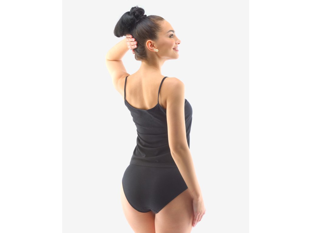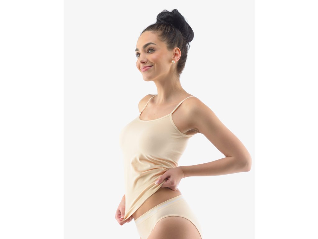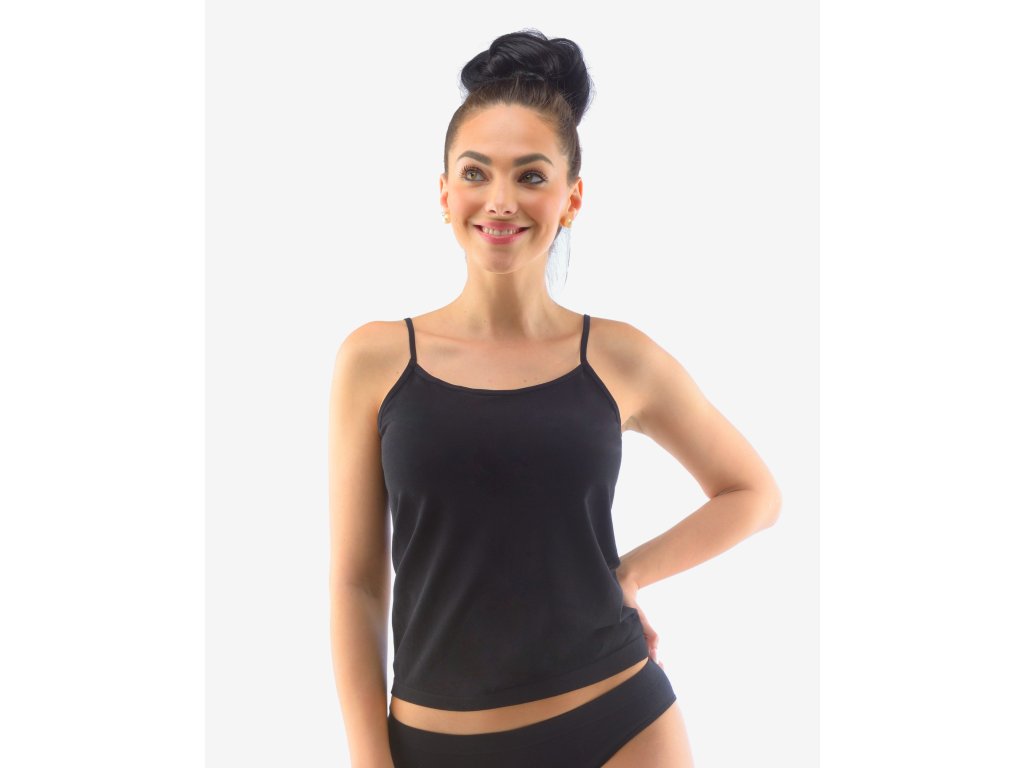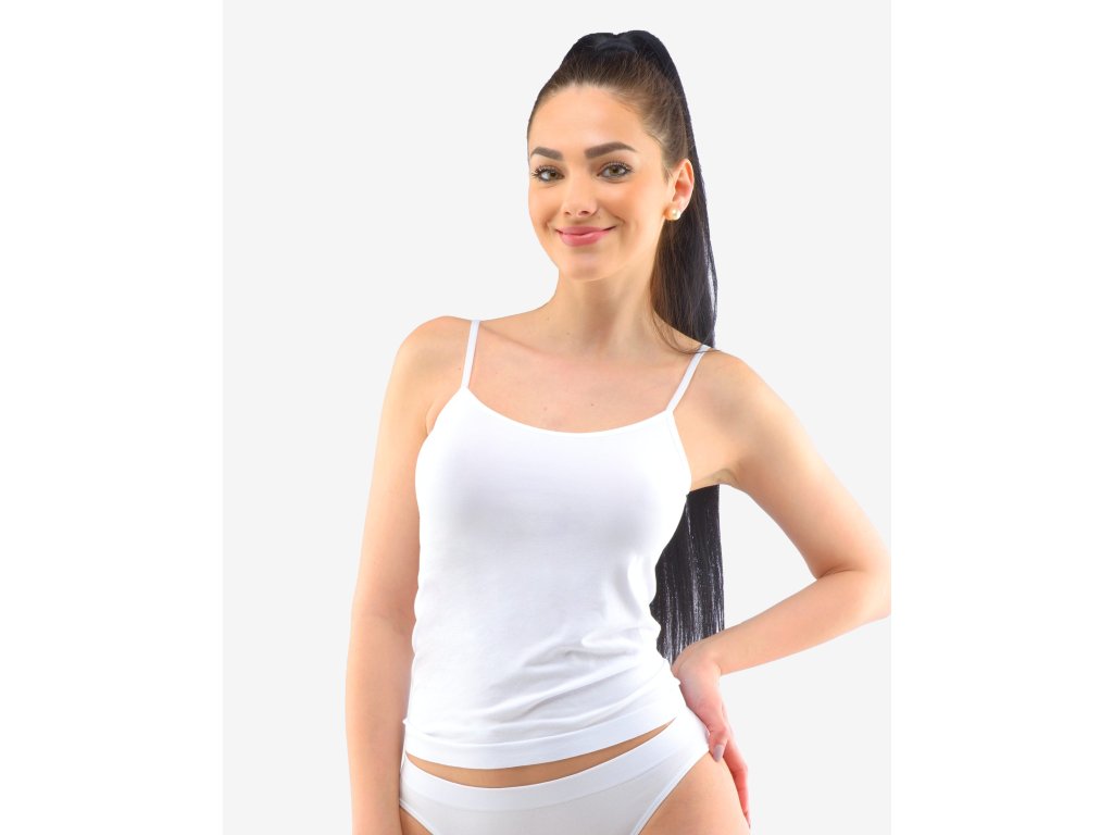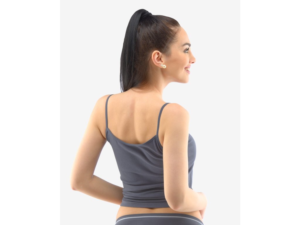 Košilka s úzkými ramínky, dámské bezešvé prádlo. Dolní kraj je zapravený bezešvým způsobem. Průramky a průkrčník jsou začištěny lemovacími proužky, které přechází do ramínek. Košilka je jednobarevná. Je bez loga. Materiál je vyroben z bambusového vlákna, které je doplněno bavlnou a elastanem. Úplet je velmi jemný a příjemný na nošení. Do každodenního prádla přináší luxusní hedvábný vzhled. Bavlna dává materiál měkčí a plnější omak. Kolekce Bamboo se vyznačuje příjemným materiálem, který je směsí bavlněného a bambusového vlákna. Dámská část kolekce je charakteristická svou jednoduchostí a množstvím trendových barevných kombinací, které se pravidelně doplňují. Všechny výrobky v této kolekci mají velmi dobrou pružnost záložek a krajů.