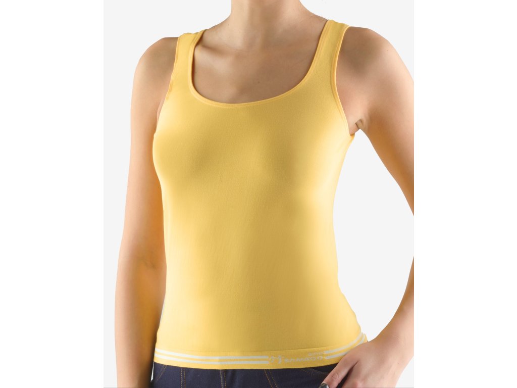 Tílko se širšími ramínky, dámské bezešvé prádlo. Dolní kraj je zapravený bezešvým způsobem. V průramcích a průkrčníku je zašitá úzká pruženka. Ramínka se na předním díle mírně zužují, čímž se vytváří pěkně tvarovaný dekolt. Tílko je jednobarevné. V záložce jsou vypletené dva barevné proužky a logo. Materiál je vyroben z bambusového vlákna, které je doplněno bavlnou a elastanem. Úplet je velmi jemný a příjemný na nošení. Do každodenního prádla přináší luxusní hedvábný vzhled. Bavlna dává materiál měkčí a plnější omak. Kolekce Bamboo se vyznačuje příjemným materiálem, který je směsí bavlněného a bambusového vlákna. Dámská část kolekce je charakteristická svou jednoduchostí a množstvím trendových barevných kombinací, které se pravidelně doplňují. Všechny výrobky v této kolekci mají velmi dobrou pružnost záložek a krajů.