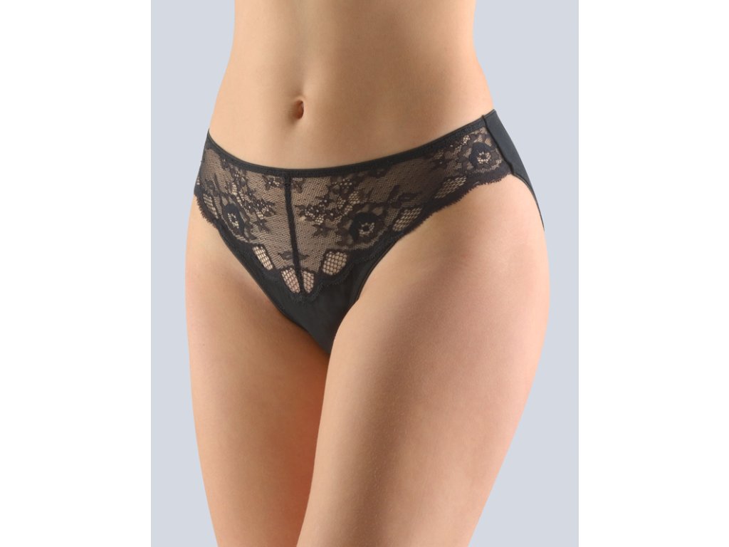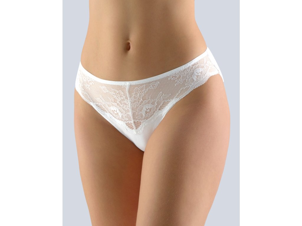 Kalhotky klasického střihu s úzkým bokem, dámské šité prádlo. V pasovém kraji je našitá pruženka s ozdobným krajem. V nohavičkách je našitá pruženka s ozdobným krajem. Kalhotky jsou zdobené krajkou na předním díle. Kalhotky jsou jednobarevné.