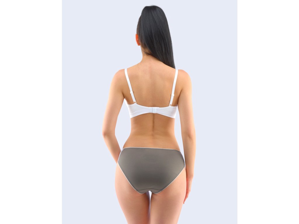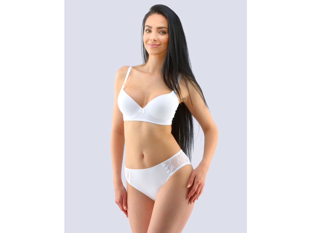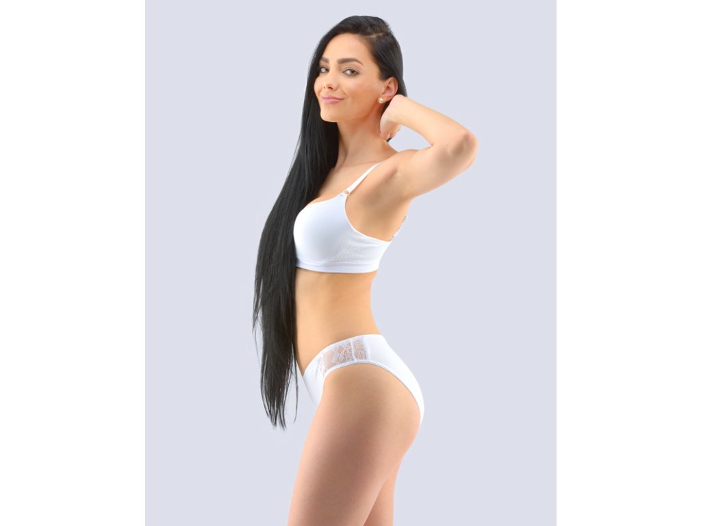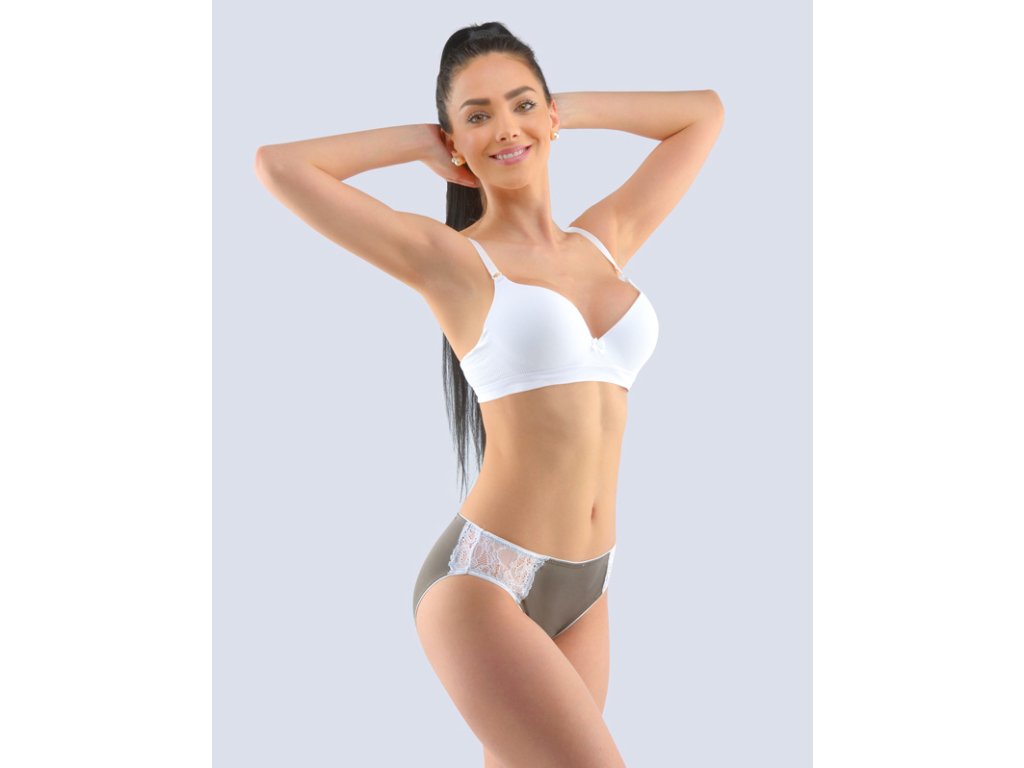 Kalhotky klasického střihu s úzkým bokem, dámské šité prádlo. V pasovém kraji je našitá pruženka s ozdobným krajem. V nohavičkách je našitá pruženka s ozdobným krajem. Kalhotky jsou zdobené krajkovou vsadkou na bocích. Kalhotky jsou jednobarevné.