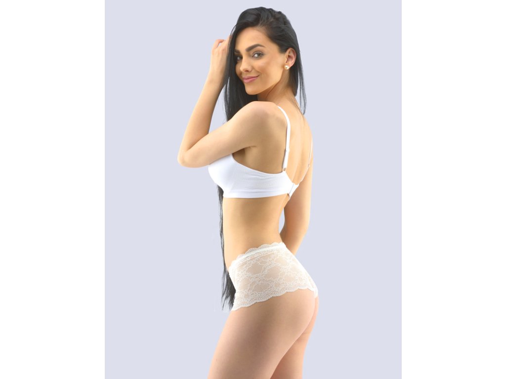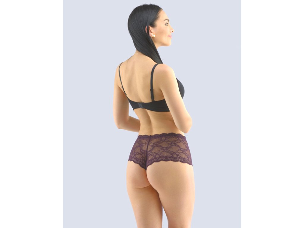 Bokové kalhotky s nohavičkou, boxerky, dámské šité prádlo. V pasovém kraji je našitá pruženka. Kalhotky jsou celokrajkové, uvnitř je všitý bavlněný klínek. Kalhotky jsou jednobarevné.