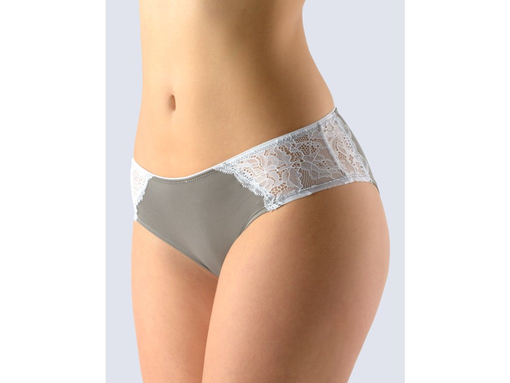 Bokové kalhotky francouzského střihu se širokým bokem, dámské šité prádlo. V pasovém kraji je našitá pruženka s ozdobným krajem. Nohavičky jsou začištěné podehnutím. Kalhotky jsou zdobené krajovými vsadkami na bocích. Kalhotky jsou jednobarevné.