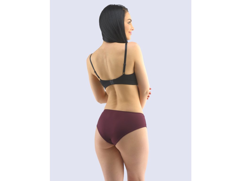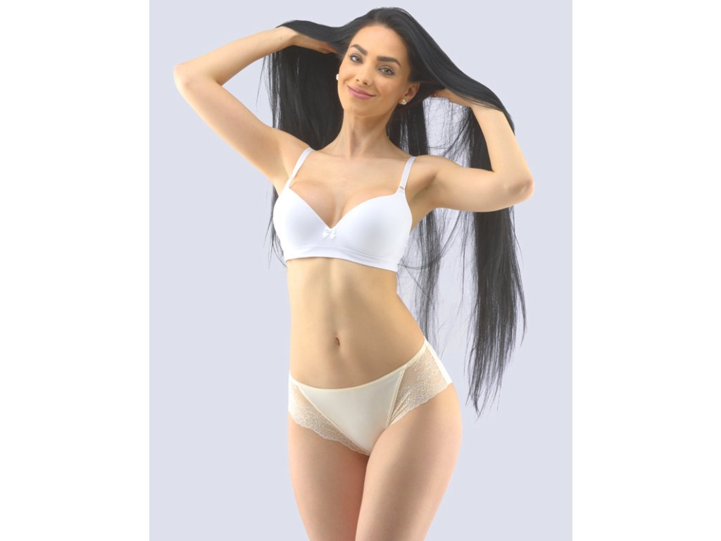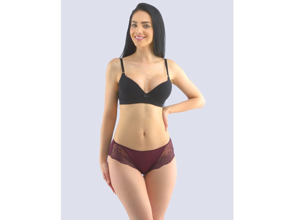 Bokové kalhotky francouzského střihu se širokým bokem, dámské šité prádlo. V pasovém kraji je našitá pruženka s ozdobným krajem. Nohavičky jsou začištěné podehnutím. Kalhotky jsou zdobené krajkovými vsadkami na předním díle. Kalhotky jsou jednobarevné.