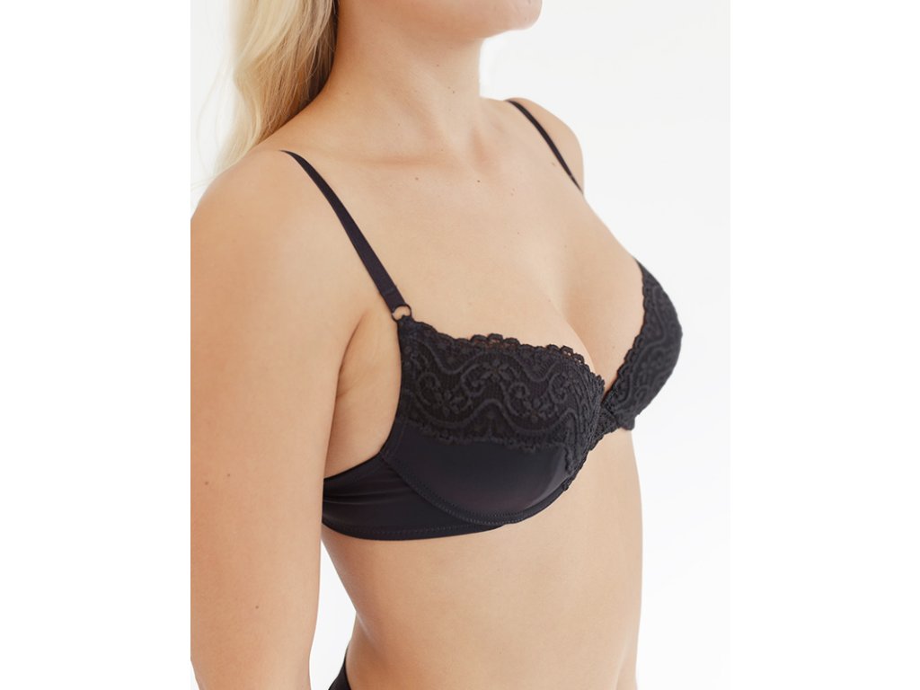 Podprsenka s kosticemi a lisovanými košíčky, dámské šité prádlo. Košíčky jsou ozdobené širokou krajkou. Ramínka jsou nastavitelná. Podprsenka je jednobarevná. Zapínání je třířadé na 2 háčky.