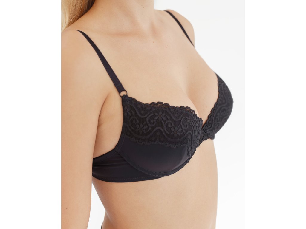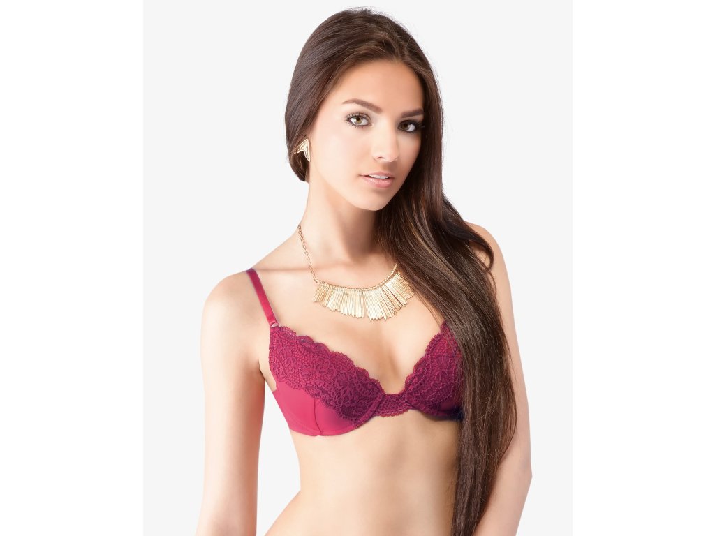 Podprsenka s kosticemi a lisovanými košíčky, dámské šité prádlo. Košíčky jsou ozdobené širokou krajkou. Ramínka jsou nastavitelná. Podprsenka je jednobarevná. Zapínání je třířadé na 2 háčky. Materiál je vyroben z polyamidového vlákna, které je doplněno elastanem. Elastan přidává materiálu pružnost a zlepšuje jeho tvarovou stálost. Materiál se vyznačuje velmi dobrou odolností a trvanlivostí barev. Luxusní dámská krajková kolekce La Femme přináší moderní i tradiční střihy kalhotek s krajkou, které lze kombinovat s podprsenkami v obdobných barvách.