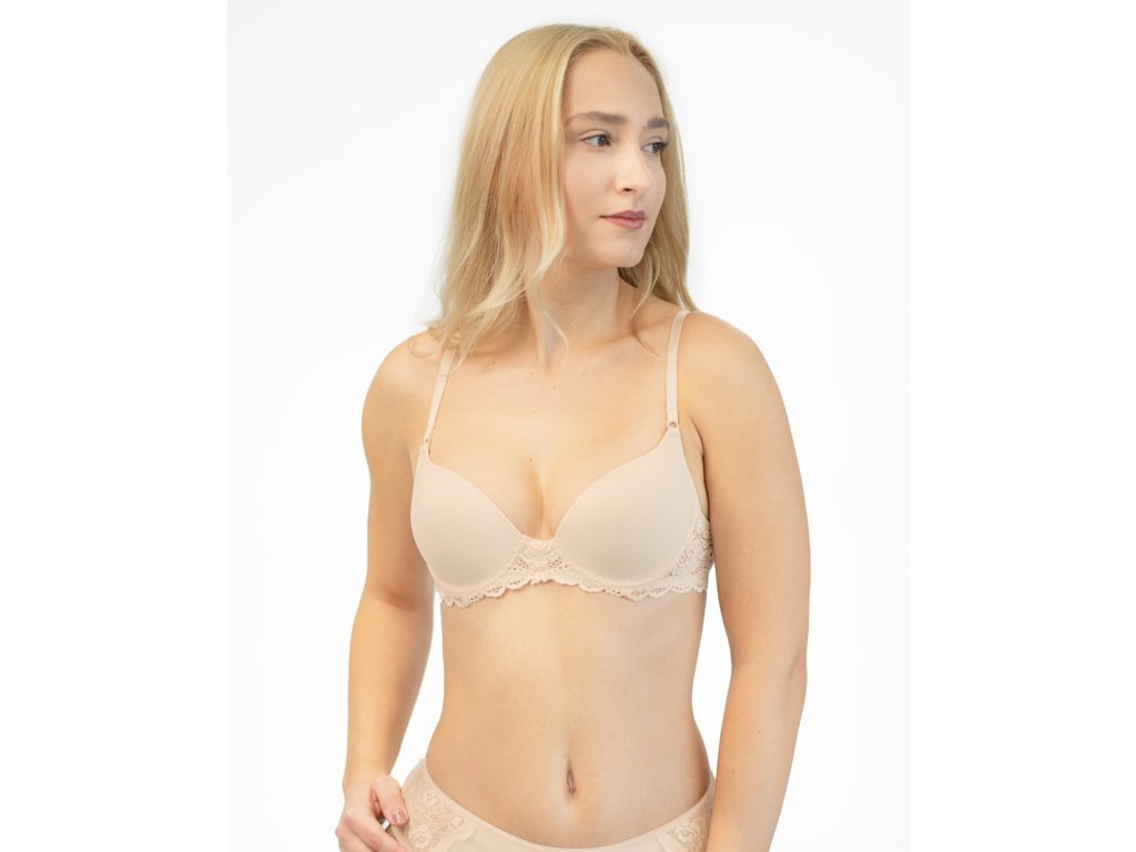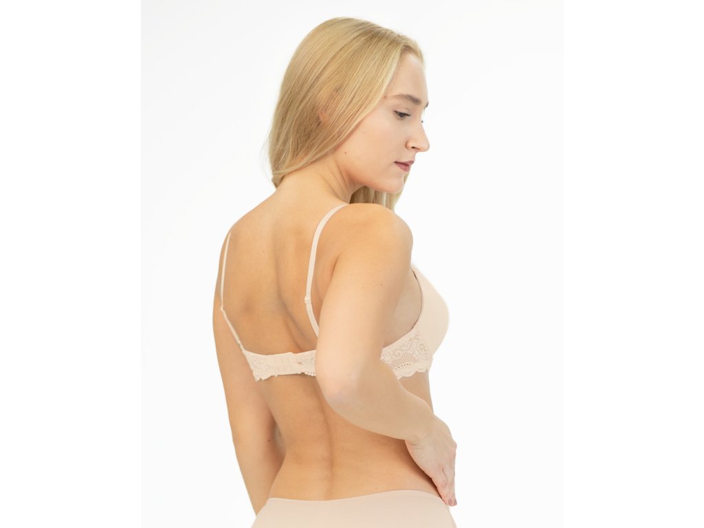 Podprsenka s kosticemi a lisovanými košíčky, dámské šité prádlo. Košíčky jsou hladké. Zadní díl je tvořený krajkou. Ramínka jsou nastavitelná. Podprsenka je jednobarevná. Zapínání je třířadé na 2 háčky. Materiál je vyroben z polyamidového vlákna, které je doplněno elastanem. Elastan přidává materiálu pružnost a zlepšuje jeho tvarovou stálost. Materiál se vyznačuje velmi dobrou odolností a trvanlivostí barev. Luxusní dámská krajková kolekce La Femme přináší moderní i tradiční střihy kalhotek s krajkou, které lze kombinovat s podprsenkami v obdobných barvách.