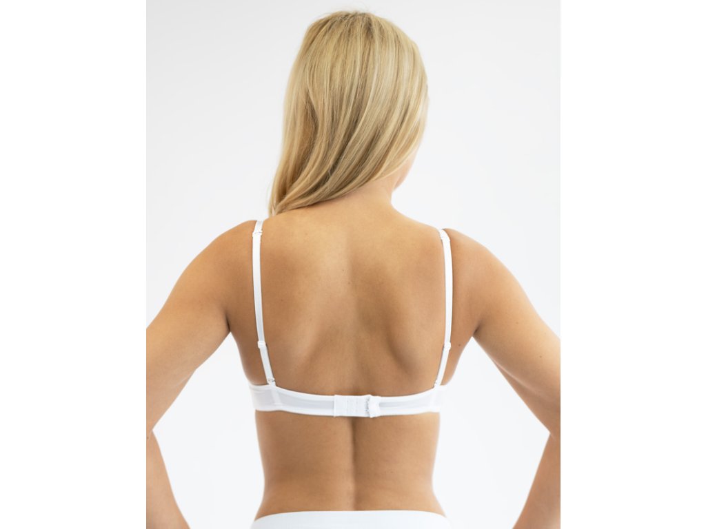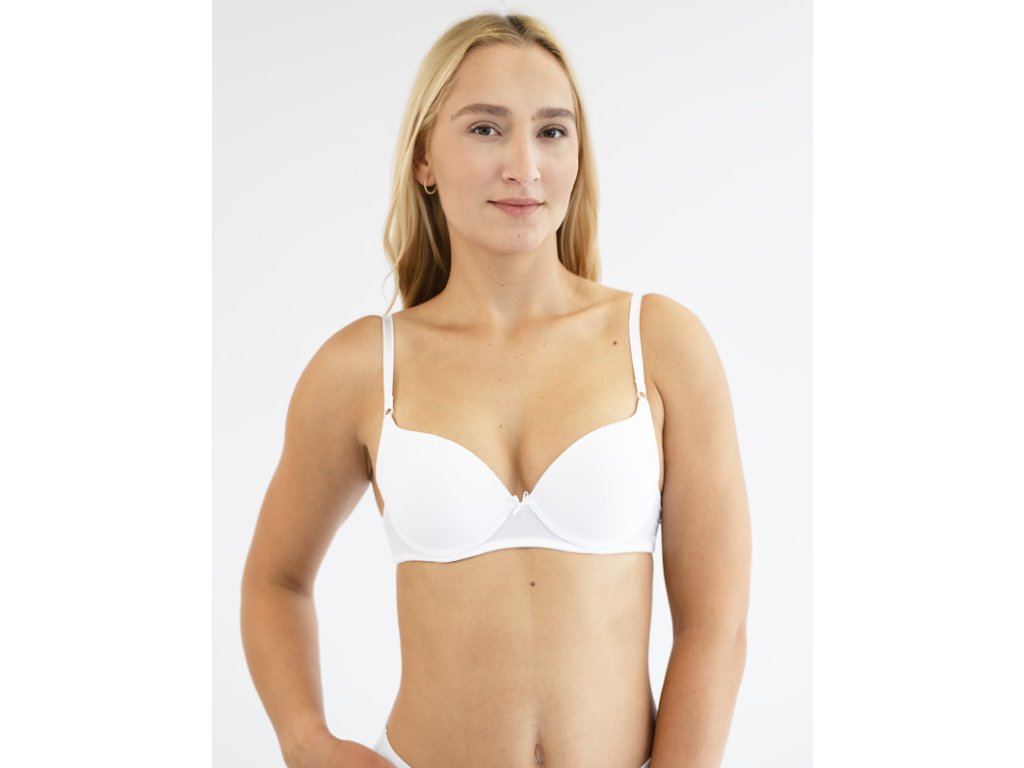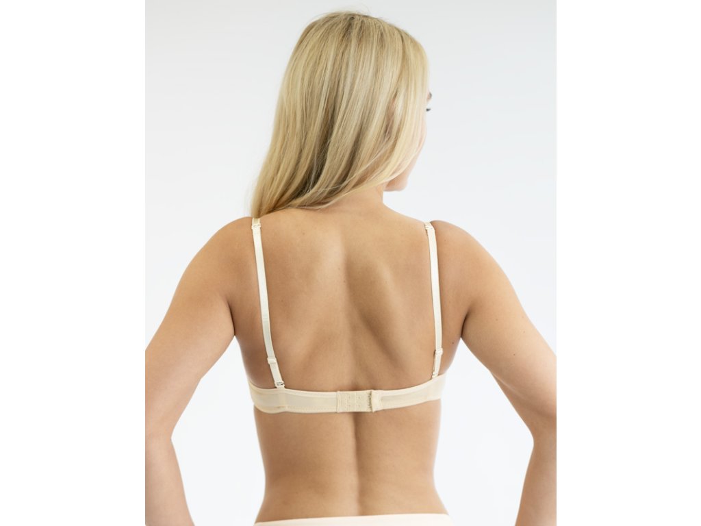 Podprsenka s kosticemi a lisovanými košíčky, dámské šité prádlo. Košíčky i zadní díl jsou hladké. Ramínka mají variabilní možnost nastavení (klasicky, do kříže, za krk). Podprsenka je jednobarevná. Zapínání je třířadé na 2 háčky.