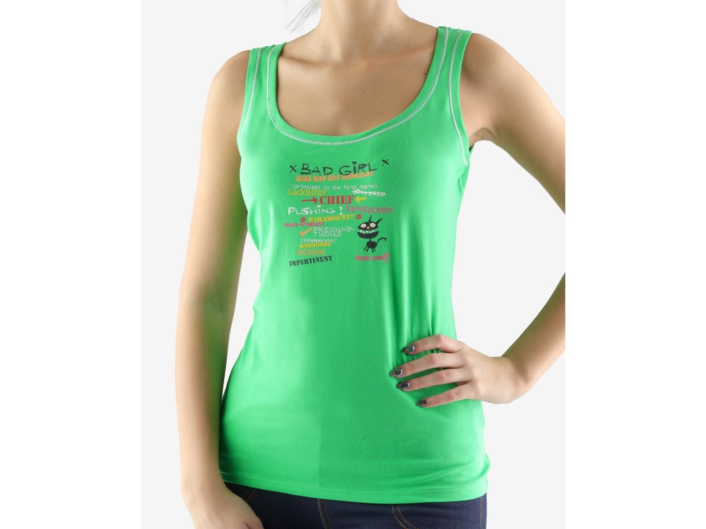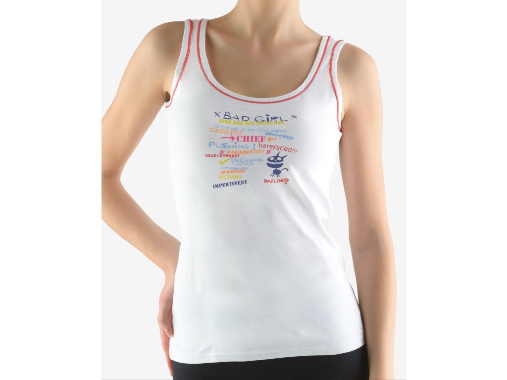 Tílko se širšími ramínky, dámské šité prádlo. Průramky a průkrčník jsou začištěny lemovacími proužky. Tílko je jednobarevné s kontrastním prošitím. Na předním díle je větší solitér. Materiál je vyroben z bavlny, která je doplněna elastanem. Úplet je vhodný pro všechny, kteří hledají přírodní materiály. Elastan přidává materiálu pružnost a zlepšuje jeho tvarovou stálost. Prádlo z tohoto materiálu je vhodné pro každodenní nošení. Kolekce Bad Girl přináší veselé kombinace trendových barev a motivů zvířátek.