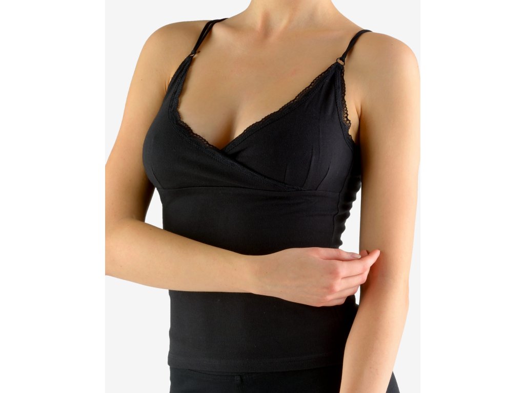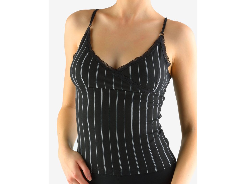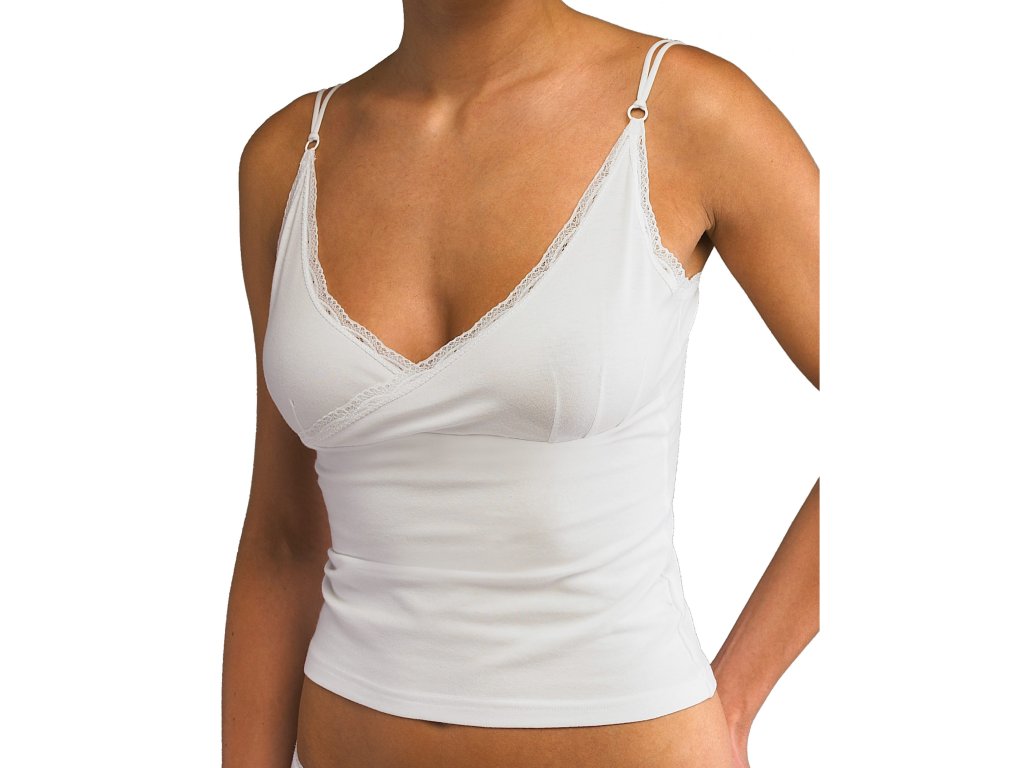 Košilka s úzkými ramínky, dámské šité prádlo. Průramky a průkrčník jsou začištěny úzkou krajkou. Přední díl je členěný pod prsy, horní část je do kříže. Ramínka jsou dvojitá. Košilka je jednobarevná. Materiál je vyroben z bavlny, která je doplněna elastanem. Úplet je vhodný pro všechny, kteří hledají přírodní materiály. Elastan přidává materiálu pružnost a zlepšuje jeho tvarovou stálost. Prádlo z tohoto materiálu je vhodné pro každodenní nošení.