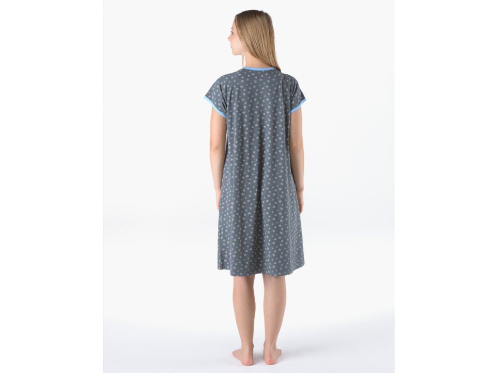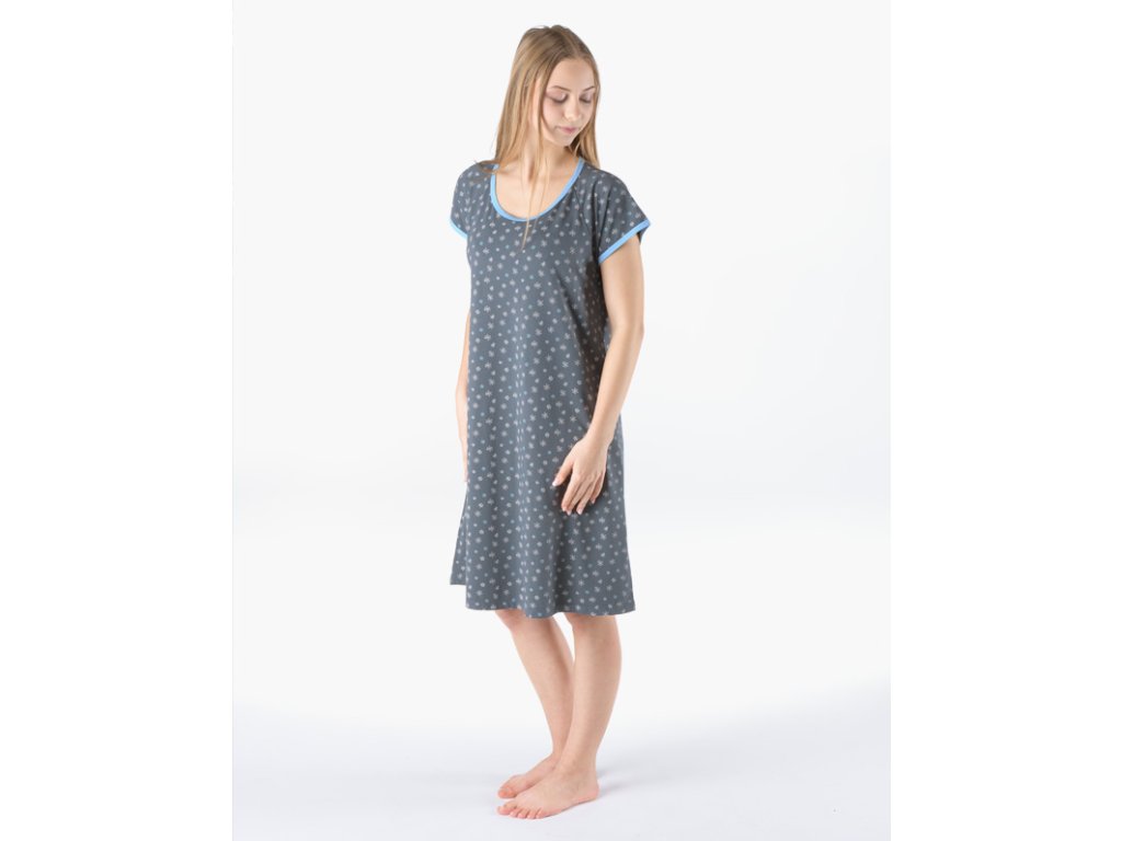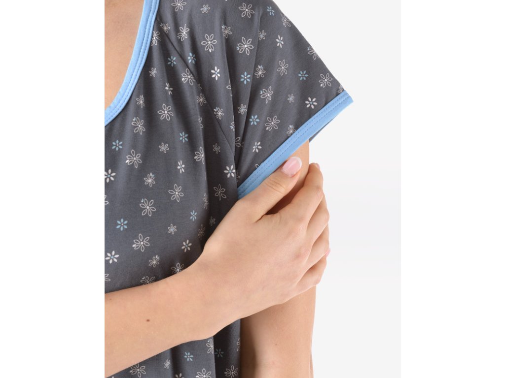 Noční košilka s krátkým rukávem Vám poskytne jedinečné pohodlí během spánku. Kulatý výstřih a rukávy jsou olemovány světle modrým proužkem, košilka je potištěna jemným květinovým vzorem.