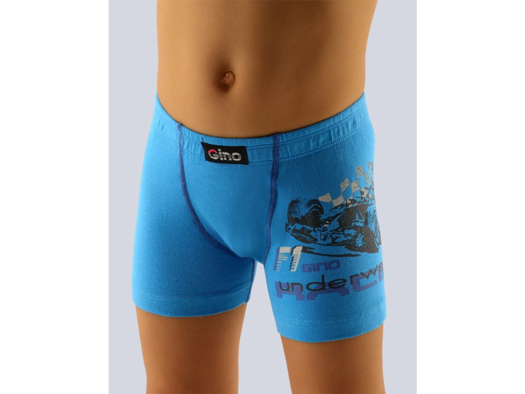 Boxerky s delší nohavičkou, chlapecké šité prádlo. V pasovém kraji je zašitá širší pruženka. Nohavičky jsou začištěné podehnutím. Zadní díl je členěný sedlem se dvěma švy. Boxerky jsou jednobarevné. Na nohavici je umístěn solitér.
