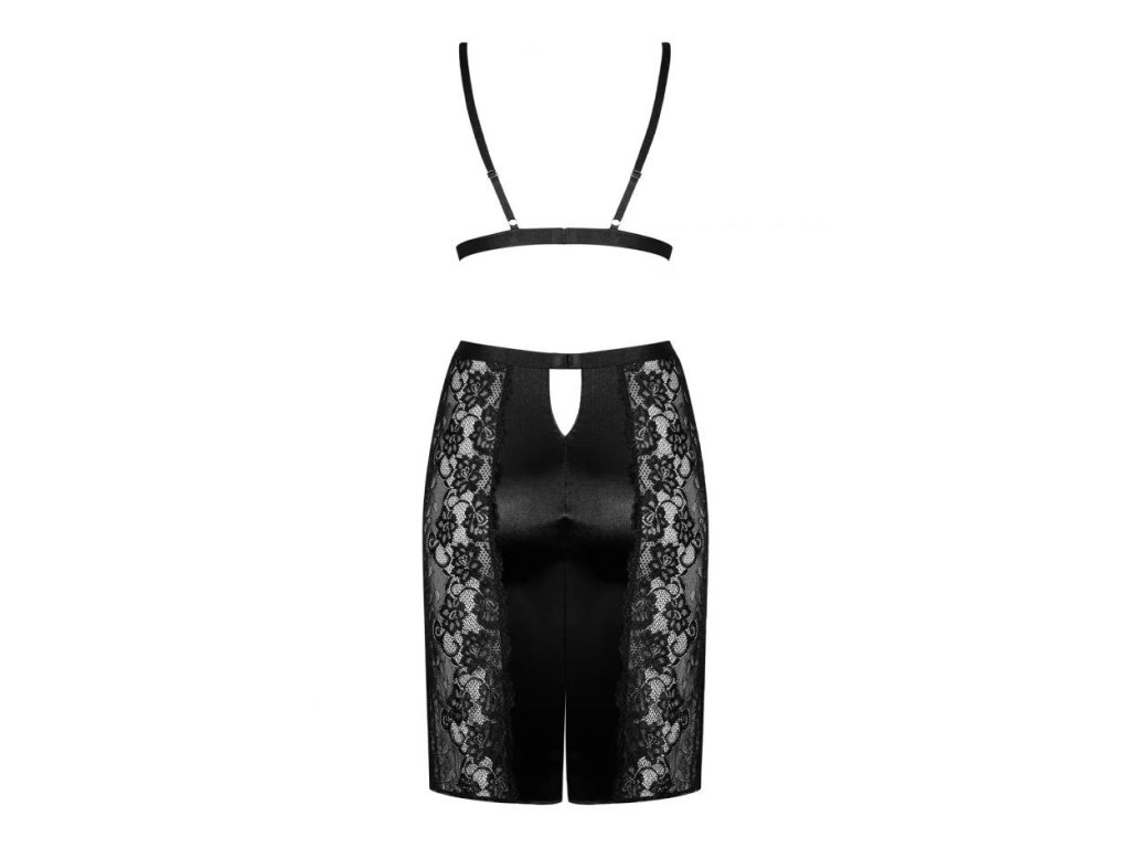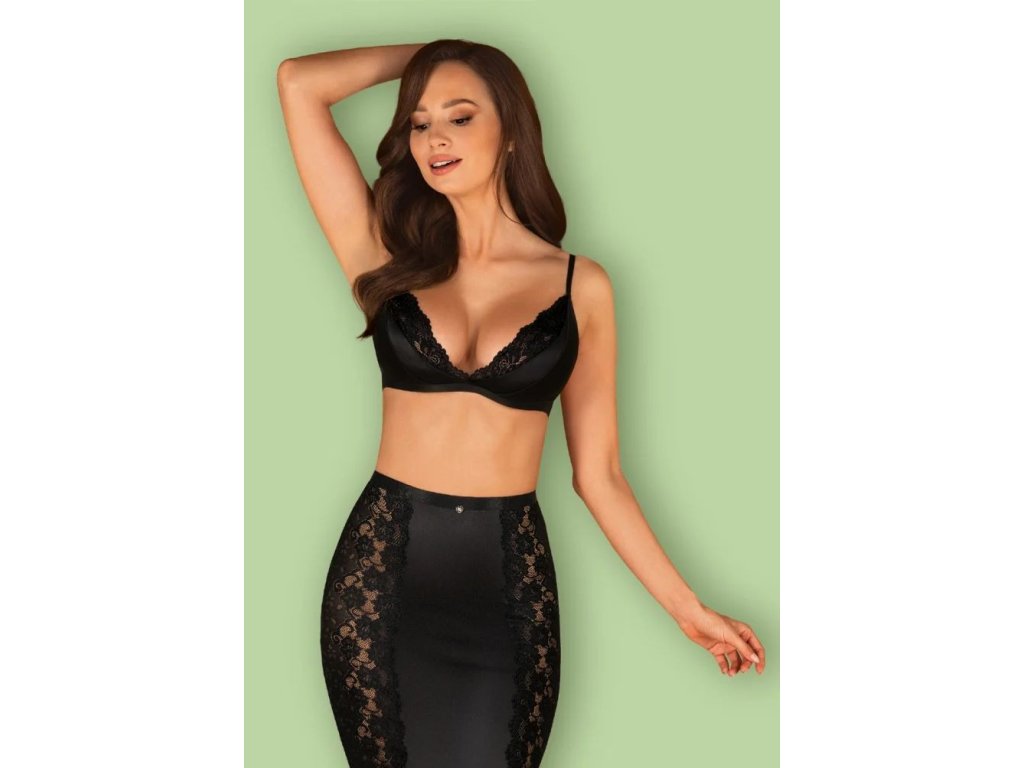 Podprsenka a sukně z černé saténové látky - decentní elegance. Nastavitelná ramínka a vícestupňové zapínání. Košíčky a boky sukně zdobí jemná krajka. Tužkový střih sukně pro dokonalé přizpůsobení. Trojúhelníkový výřez na zádech. Vysoký pas pro zvýraznění pasu. Jemná visačka na přední straně Příjemný na dotek, pružný materiál.