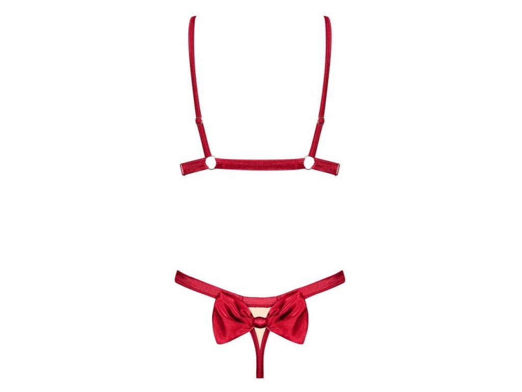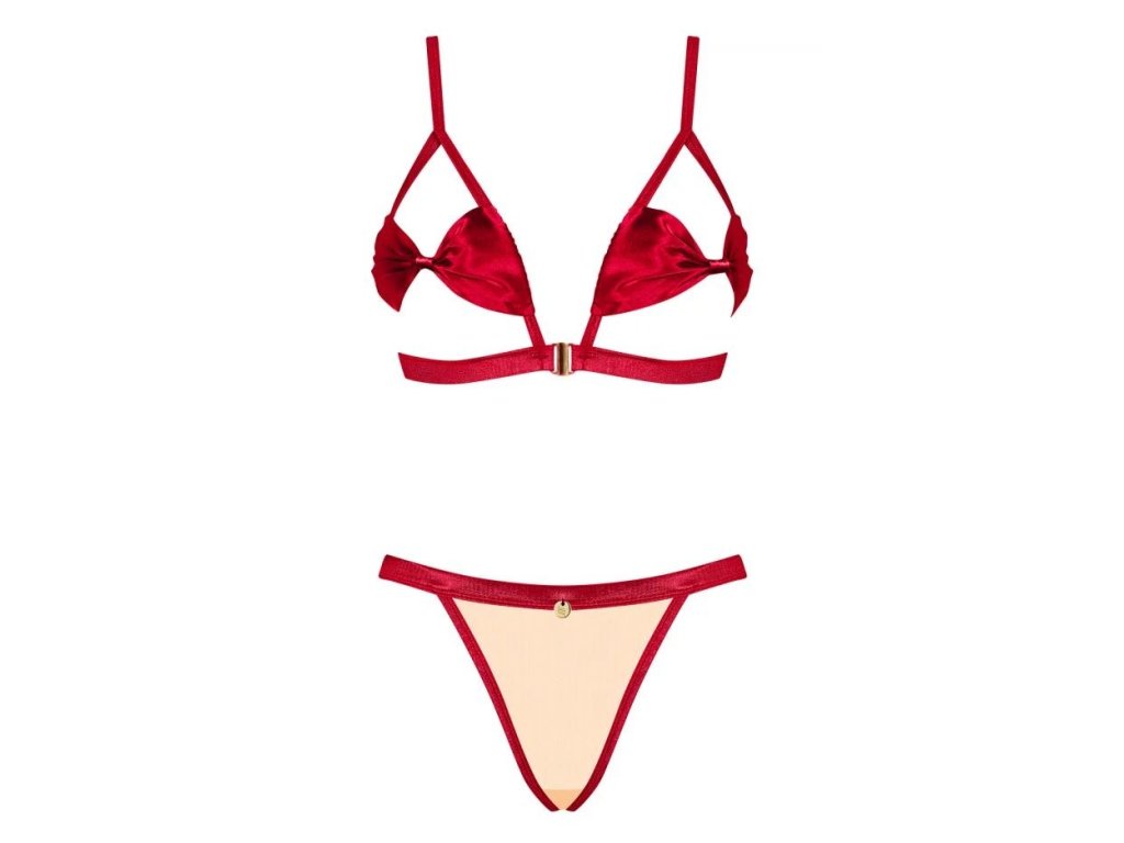 Svůdná podprsenka a tanga ze saténové látky. Jemná, nastavitelná ramínka - záruka, že vám vše dokonale padne. Částečně otevřené košíčky dokonale zvýrazní prsa. Podprsenka se vpředu rozepíná. Smyslné mašličky zdobí poprsí a hýždě. Tanga vytvořená z kombinace látky tělové barvy a červeného saténu. Bohaté zdobení - kovové ozdoby ve zlaté barvě a přívěsek na tangách. Příjemný na dotek, elastický materiál.