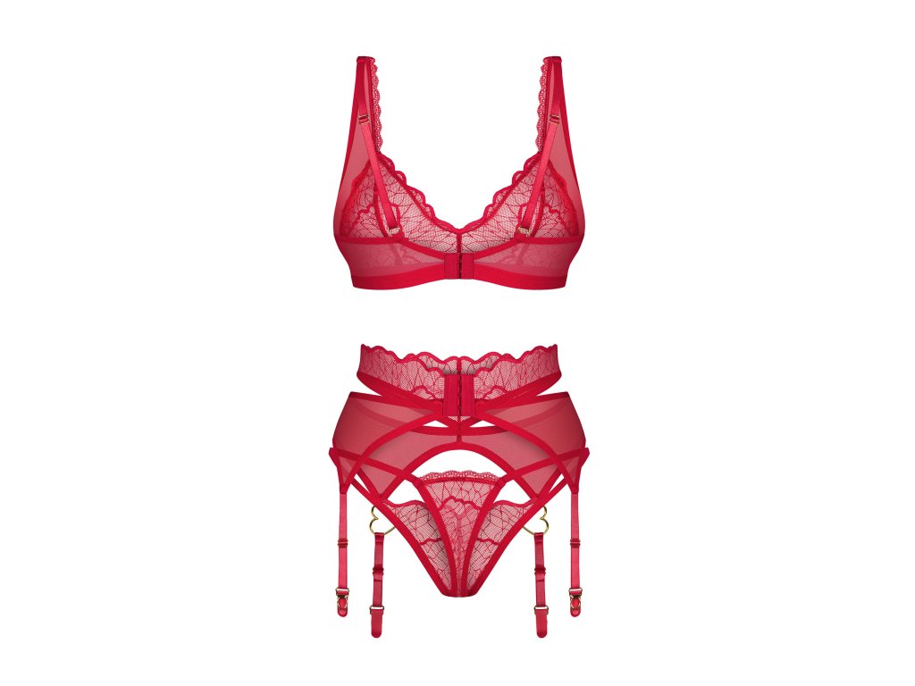 Třídílná souprava Cupide Desir ● ultra moderní design a smyslná červená barva ● skládá se z podprsenky, tang a podvazkového pásu s integrovanými pásky ● průhledná síťovina je kombinována s jemnou výšivkou ● celek je ještě půvabnější díky zlatým akcentům ve tvaru srdce a minimalistickému přívěsku - vícestupňové zapínání na zádech, nastavitelné pásky a podvazkové pásky - měkké, vysoce kvalitní materiály - neobsahují nikl