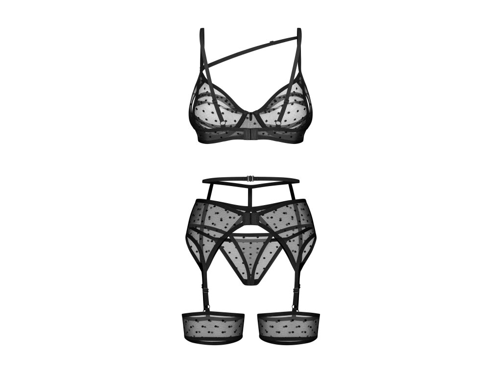 Třídílná souprava Nuites ● podprsenka, tanga a podvazkový pás ● z průhledné síťoviny ● zdobená elegantním hráškovým vzorem ● podprsenka je nad výstřihem zdobená jemnou stužkou, jemnou stužkou nad dekoltem spojenou s ramínky ● soupravu doplňují tanga s nízkým pasem ● na dotek příjemná tkanina ● košíčky s kosticemi ● ozdobný pásek nad poprsím a elastický pas ● nastavitelná ramínka a podvazkový pás ● zapínání na háčky a očka na zádech