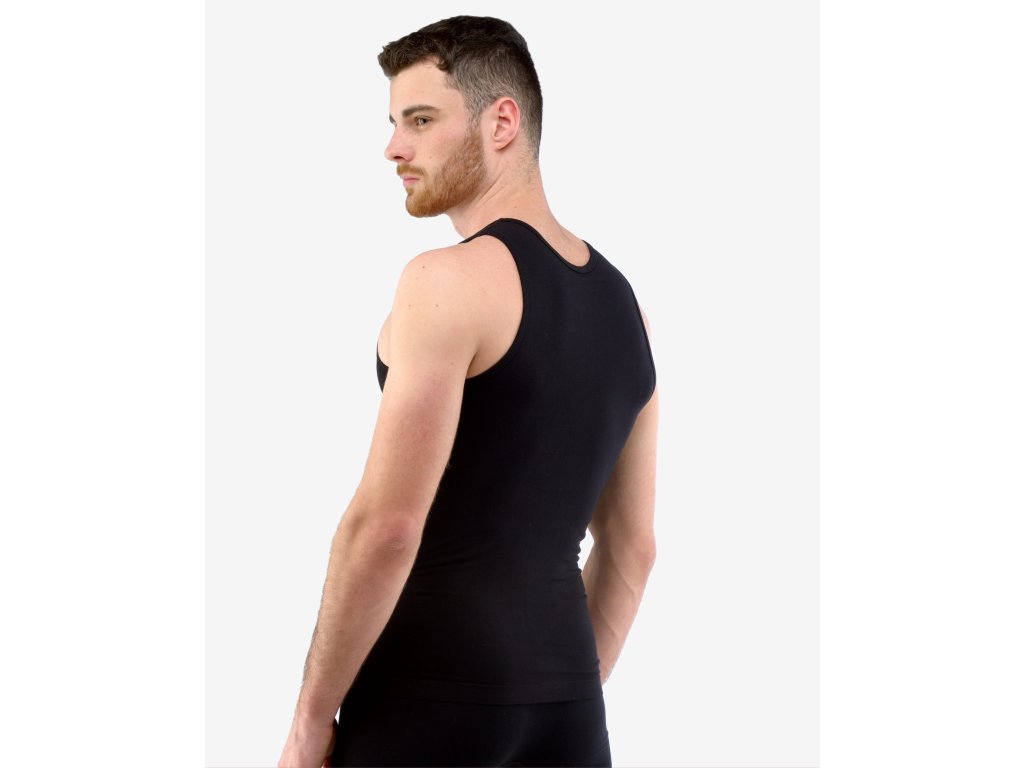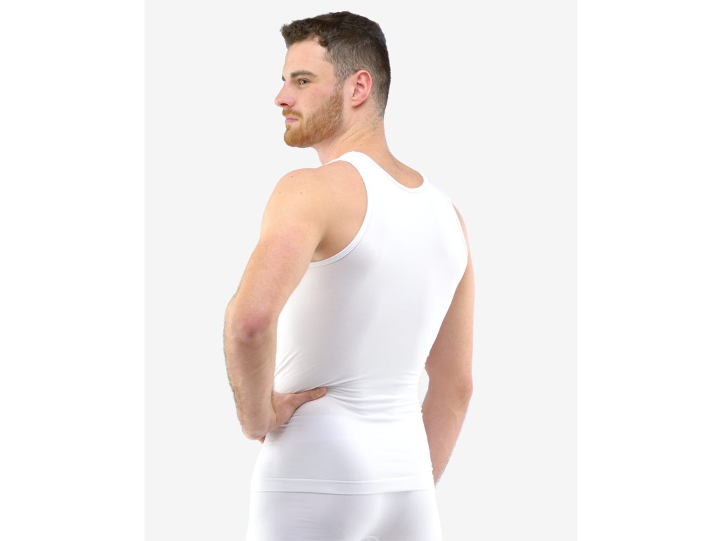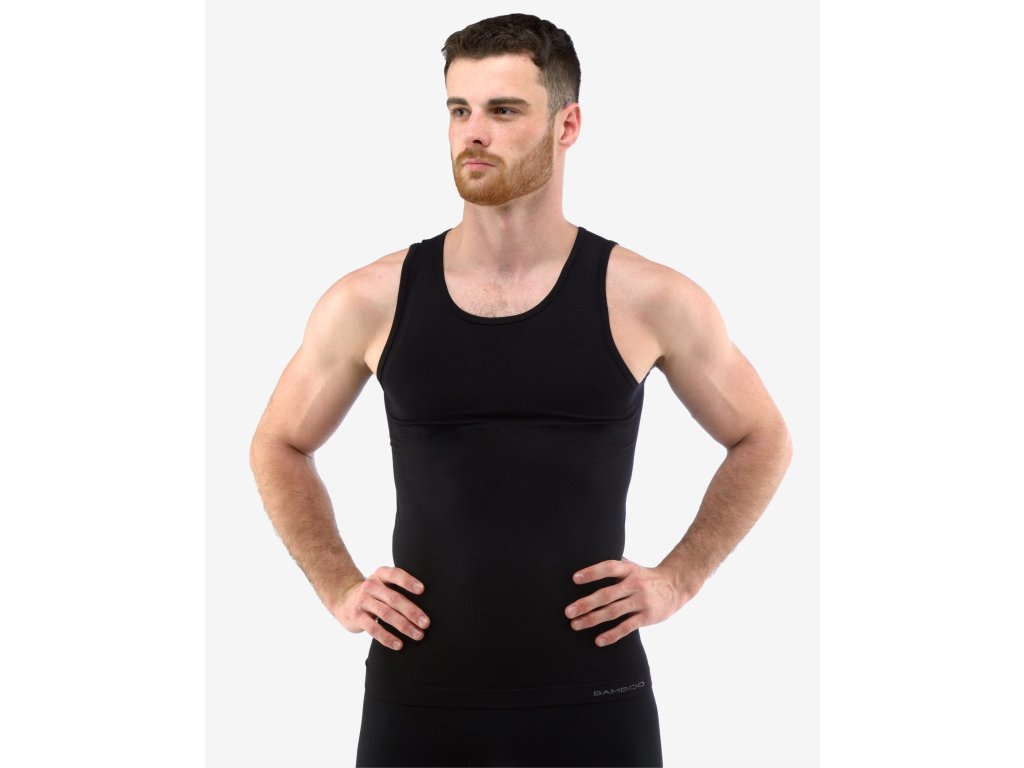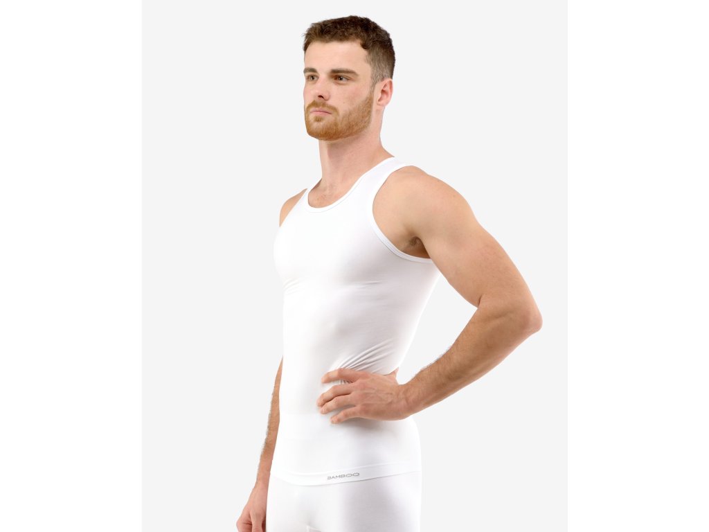 Nátělník se širšími ramínky, pánské bezešvé prádlo. Dolní kraj je zapravený bezešvým způsobem. Průramky a průkrčník jsou začištěny lemovacími proužky. Nátělník je jednobarevný. V záložce je vypletené logo. Materiál je vyroben z bambusového vlákna, které je doplněno elastanem. Úplet je velmi jemný a příjemný na nošení. Do každodenního prádla přináší luxusní hedvábný vzhled. Luxusní kolekce bezešvého prádla ECO Bamboo má nejvyšší podíl bambusového vlákna. V této kolekci jsme se zaměřili na ekologické zpracování jak samotného vlákna, tak postupů při barvení a konečné úpravě textilie. Prádlo je baleno v ekologických sáčcích a doplněno krabičkou bez laminace.