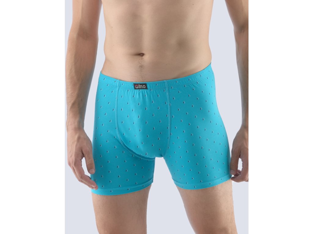 Boxerky s delší nohavičkou v nadměrných velikostech, pánské šité prádlo. V pasovém kraji je zašitá širší pruženka. Nohavičky jsou začištěné podehnutím. Zadní díl je členěný sedlem se dvěma švy. Boxerky jsou potištěné drobným vzorem (plachetnice).
