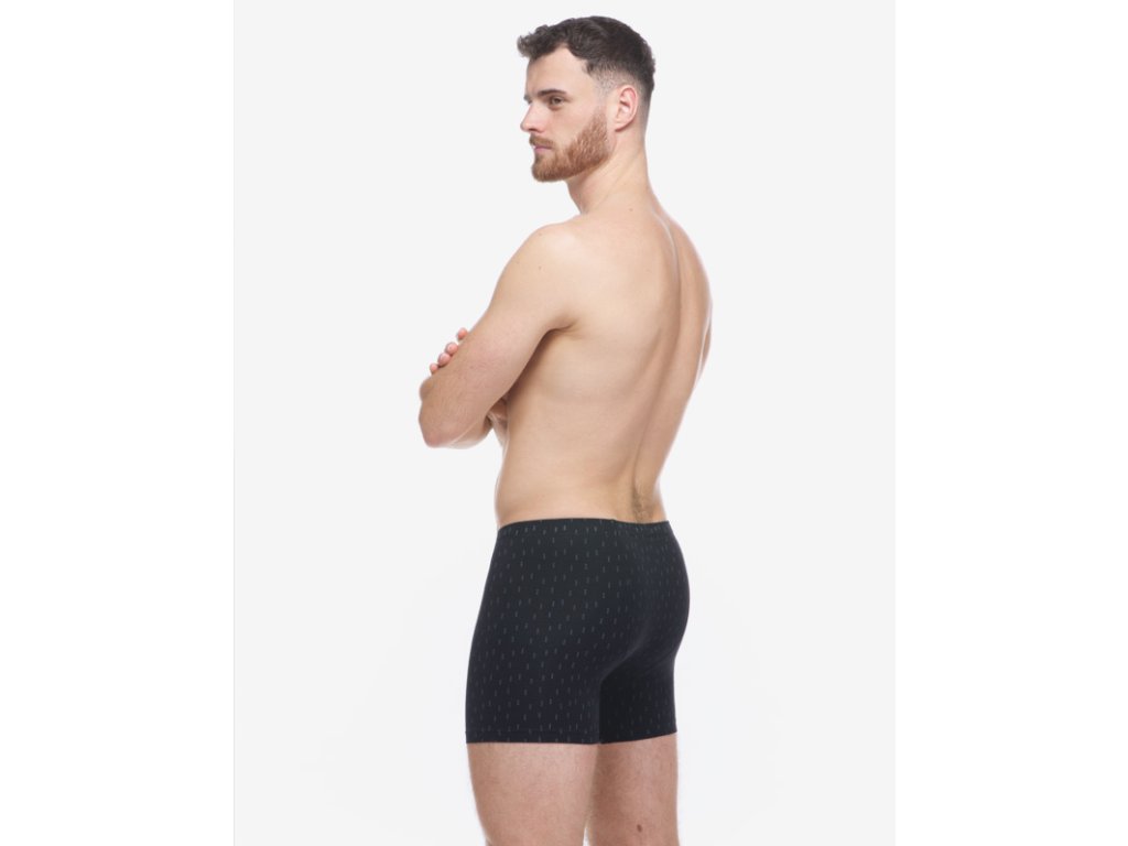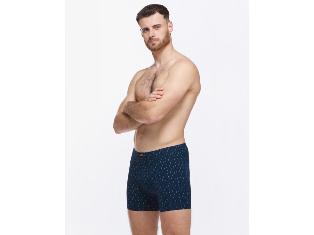Pánské boxerky s delší nohavičkou, jejich zadní díl je členěný sedlem se dvěma švy. Boxerky jsou potištěny drobným motivem. Bavlněný úplet je doplněn o pružná elastanová vlákna, díky kterým je materiál velmi přizpůsobivý a pohodlný.