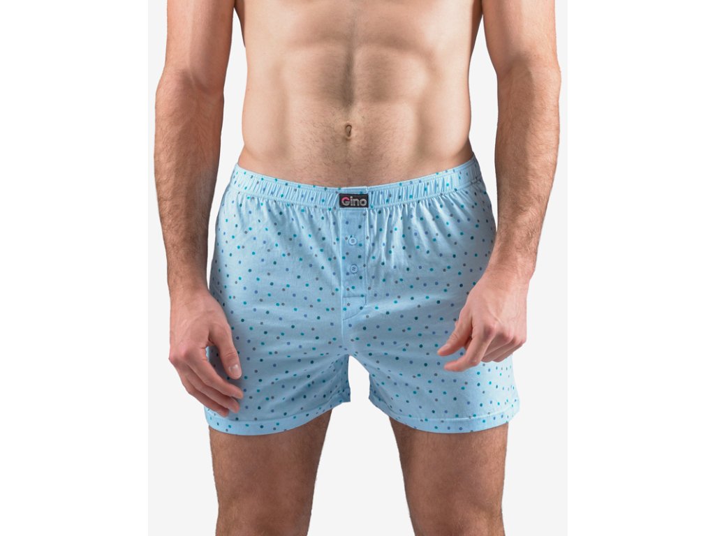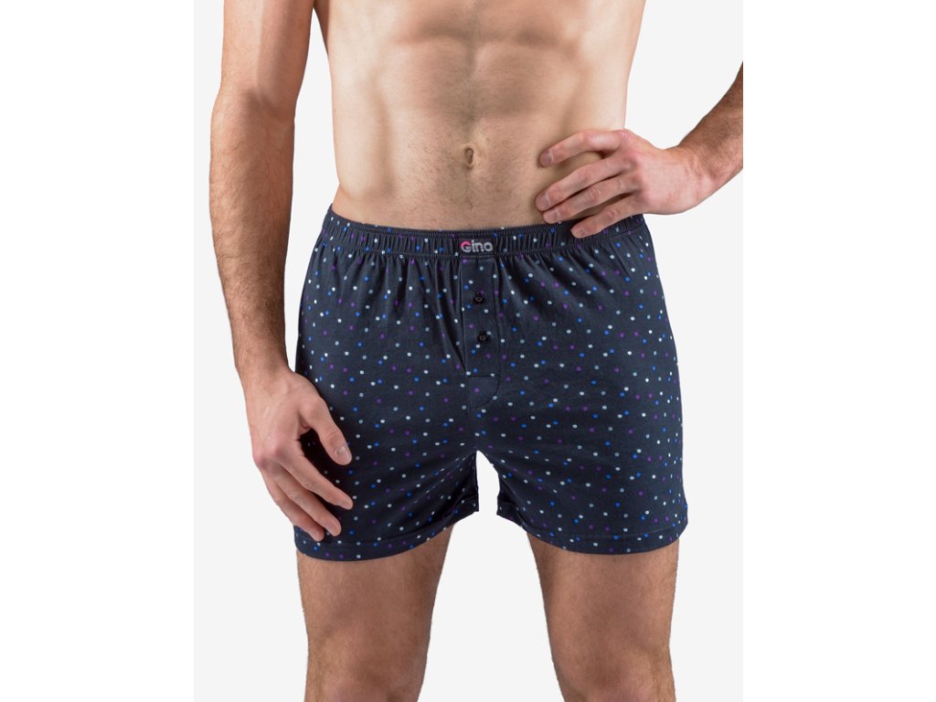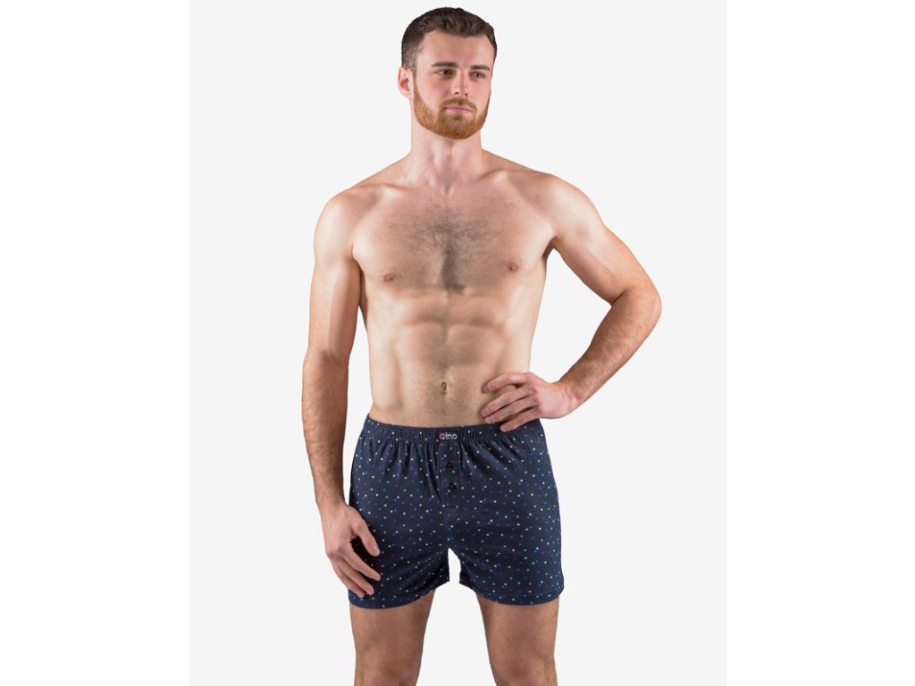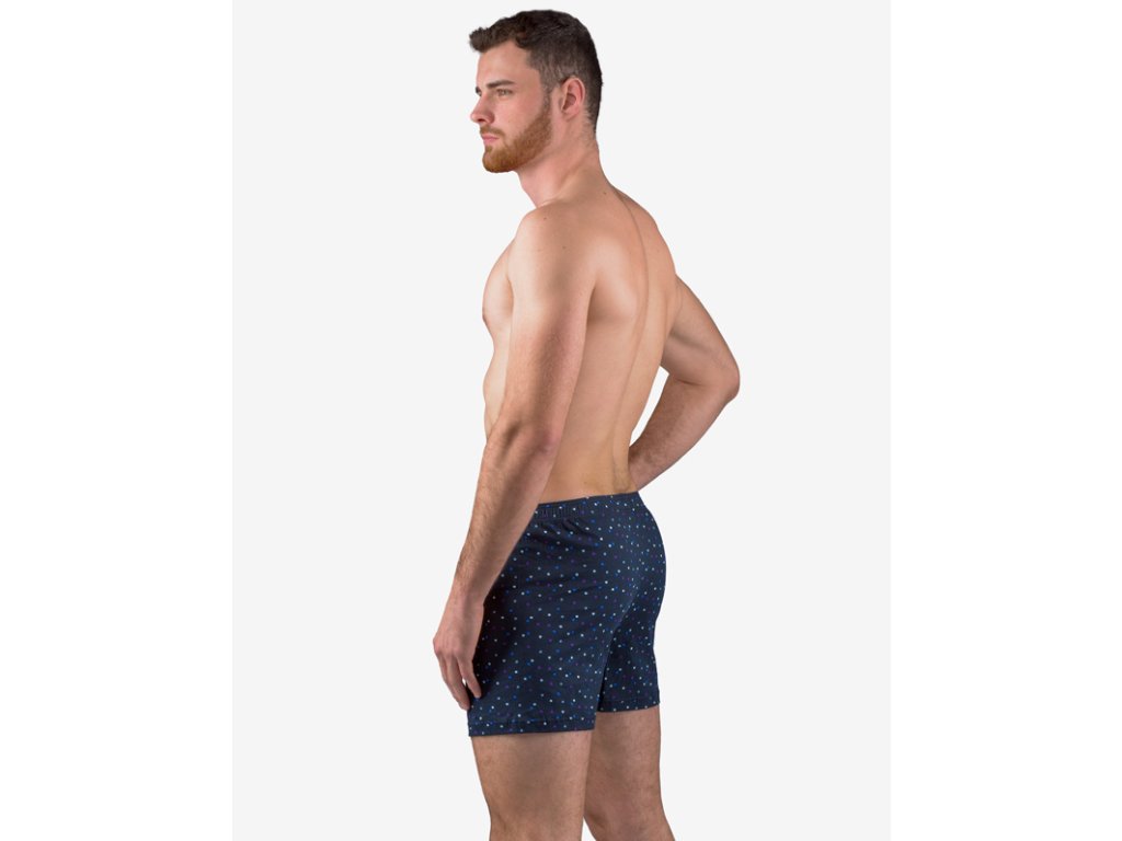 Volné trenky, pánské šité prádlo. V pasovém kraji je zašitá širší pruženka. Nohavičky jsou začištěné podehnutím. Na předním díle je vypracovaný rozparek na 2 knoflíky. Zadní díl je členěný středovým švem. Trenky jsou potištěné drobným vzorem.