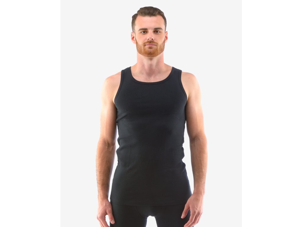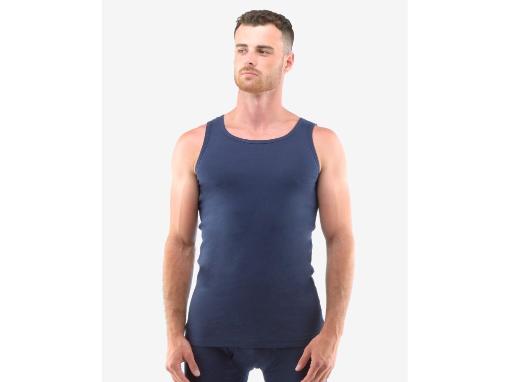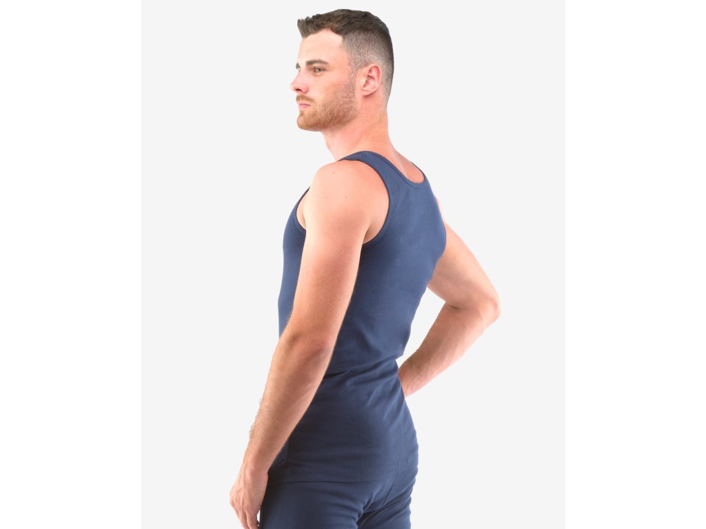 Nátělník se širšími ramínky z žebrového úpletu, pánské šité prádlo. Průramky a průkrčník jsou začištěny lemovacími proužky. Nátělník je jednobarevný. Použitý jemný žebrový úplet je pružný a velmi příjemný na nošení. Materiál je vyroben ze 100% bavlny. Úplet je vhodný pro všechny, kteří hledají přírodní materiály. Prádlo z tohoto materiálu je vhodné pro každodenní nošení.