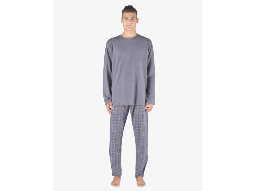 Pánské klasické pyžamo volného střihu z jemného úpletu Vám poskytne pohodlí během spánku. Kalhoty s oblíbeným vzorem káro doplňuje jednobarevné triko s dlouhými rukávy.