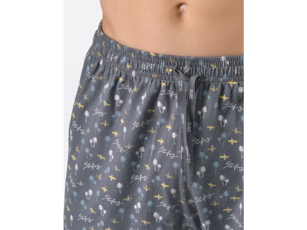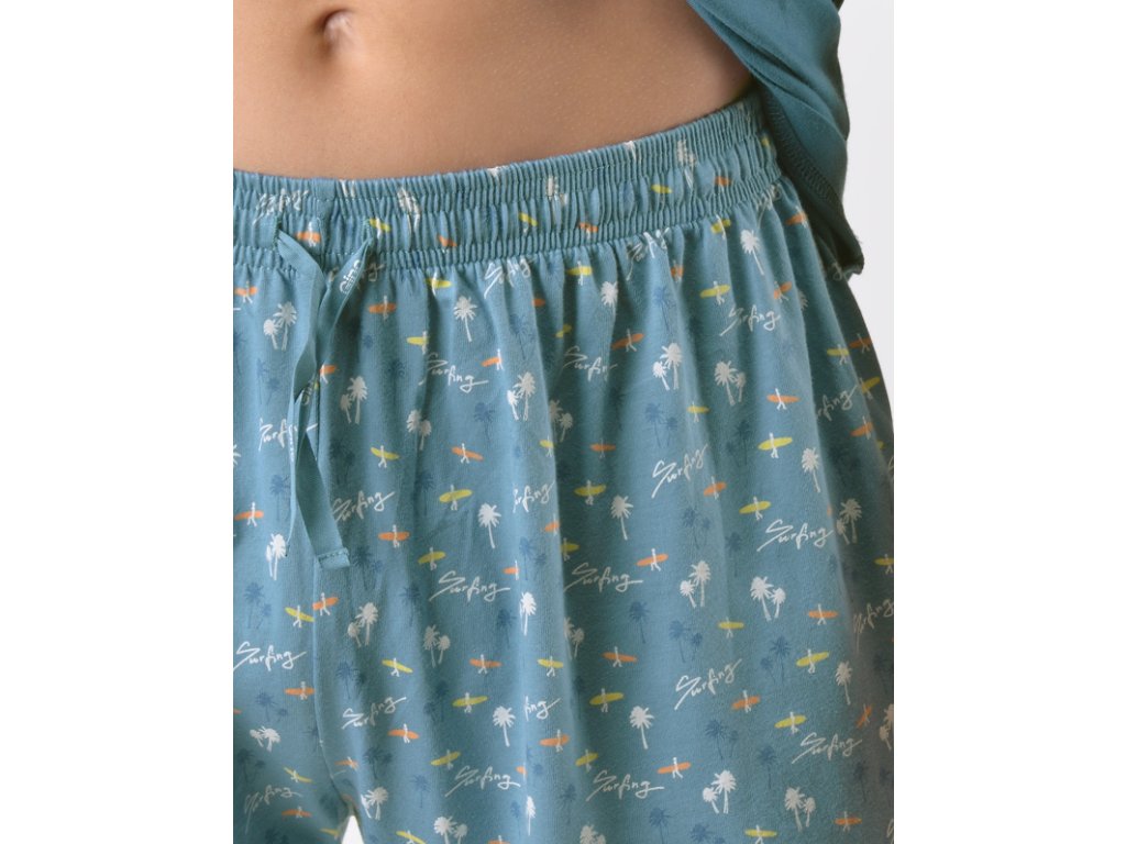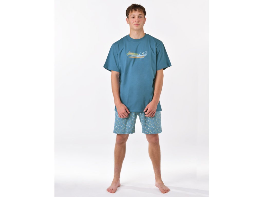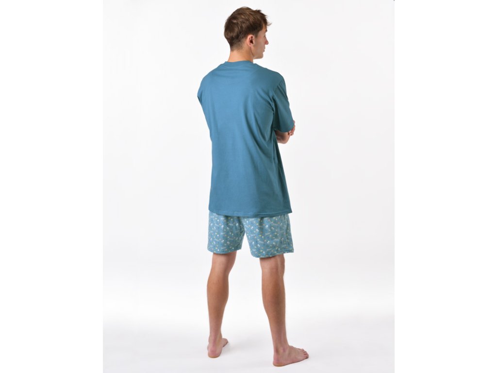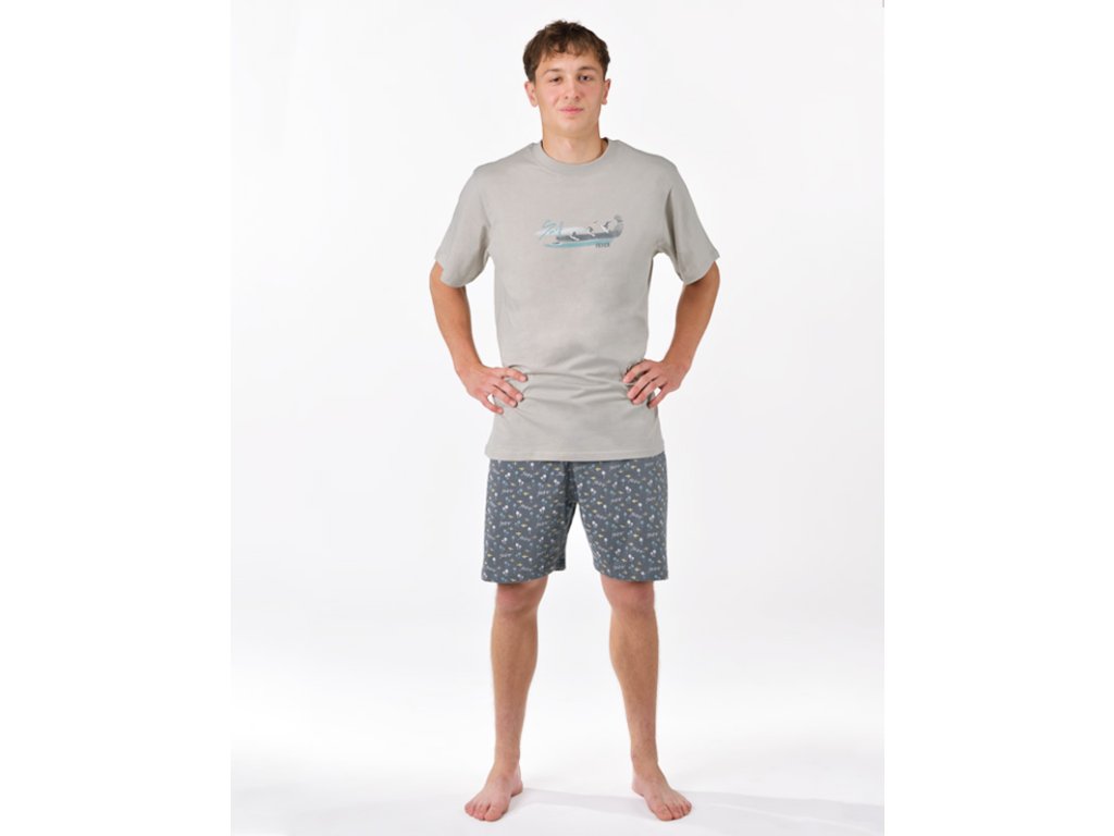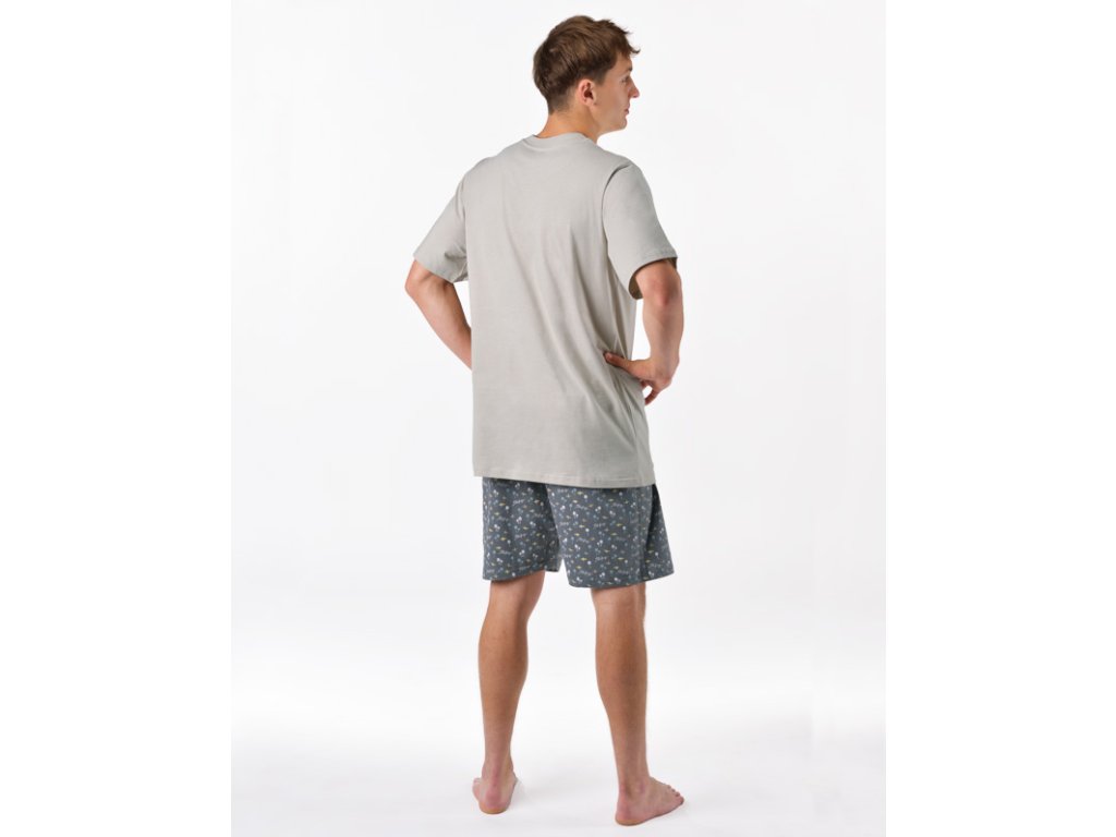 Pánské pyžamo volného střihu z jemného úpletu Vám poskytne pohodlí během spánku. Krátké kalhoty jsou potištěny drobným vzorem, triko s krátkými rukávy zdobí větší potisk na hrudi.