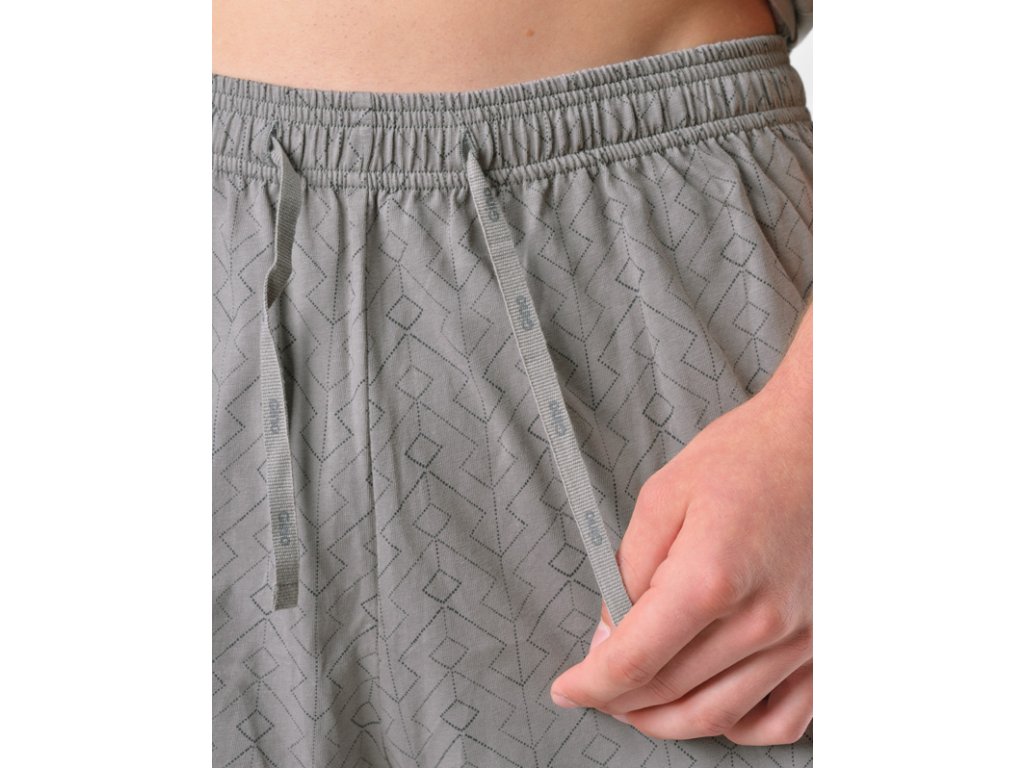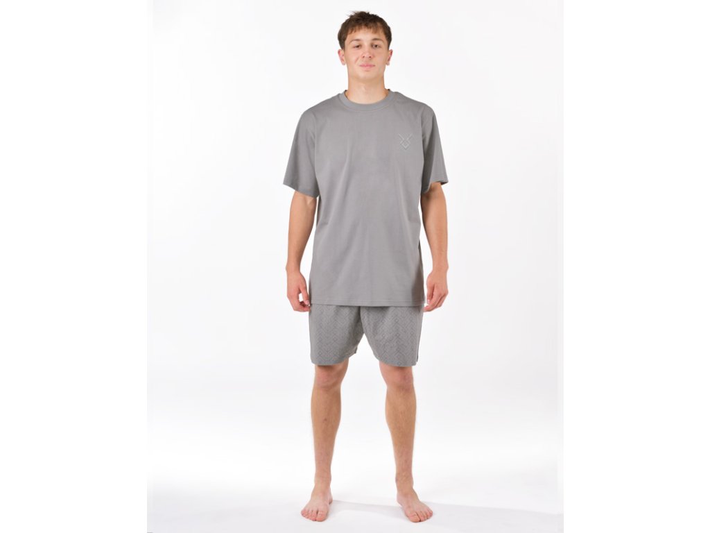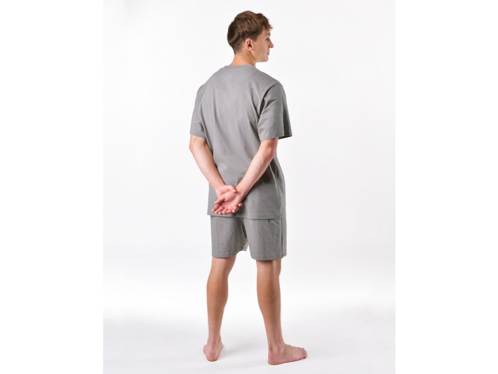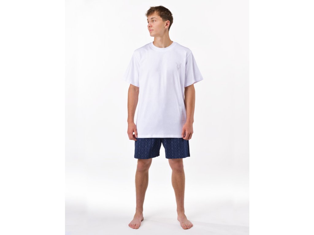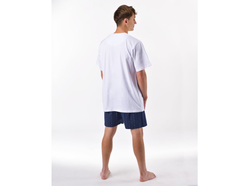 Pánské pyžamo volného střihu z jemného úpletu Vám poskytne pohodlí během spánku. Krátké kalhoty jsou potištěny drobným vzorem, triko s krátkými rukávy zdobí menší potisk na hrudi.