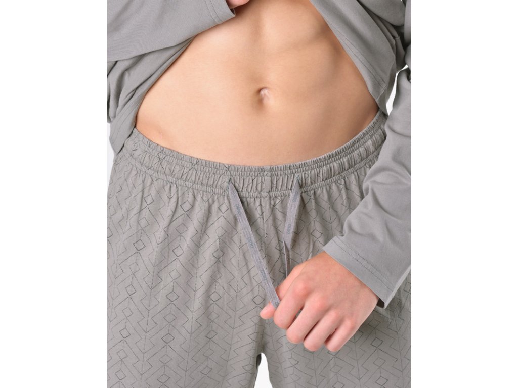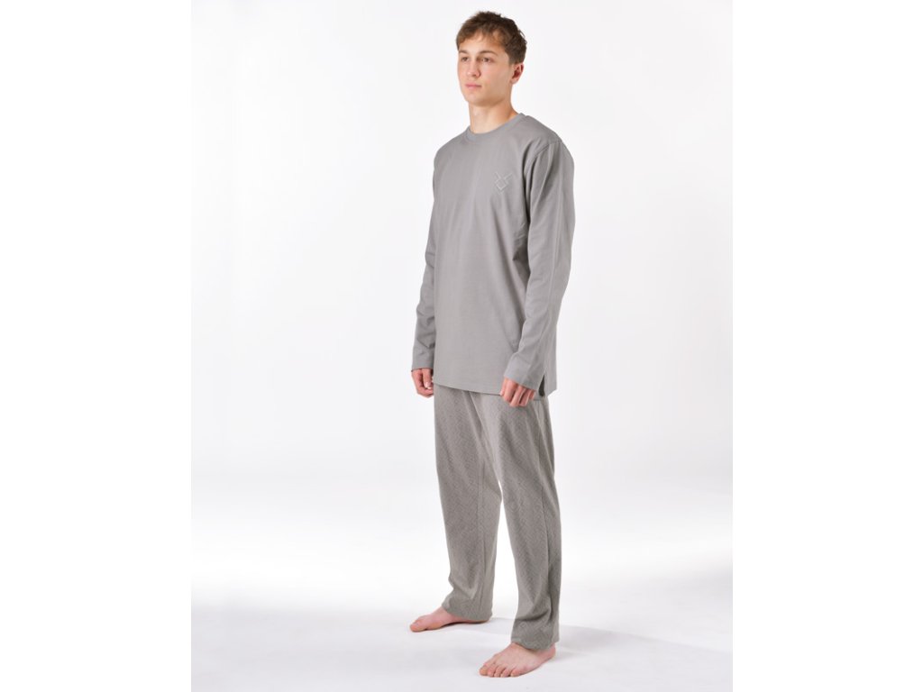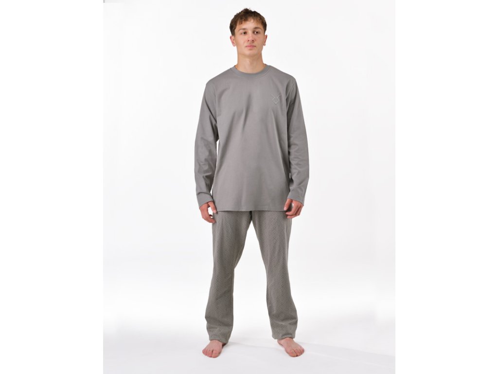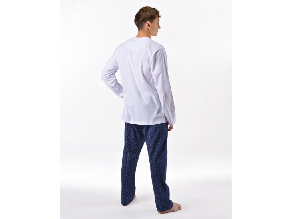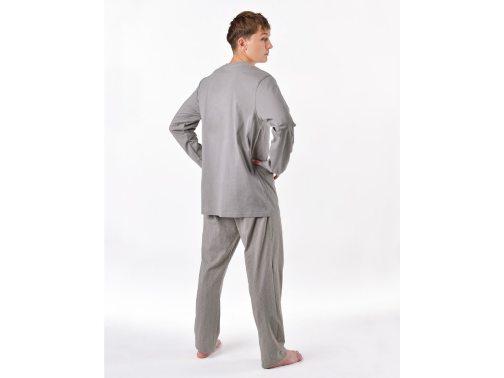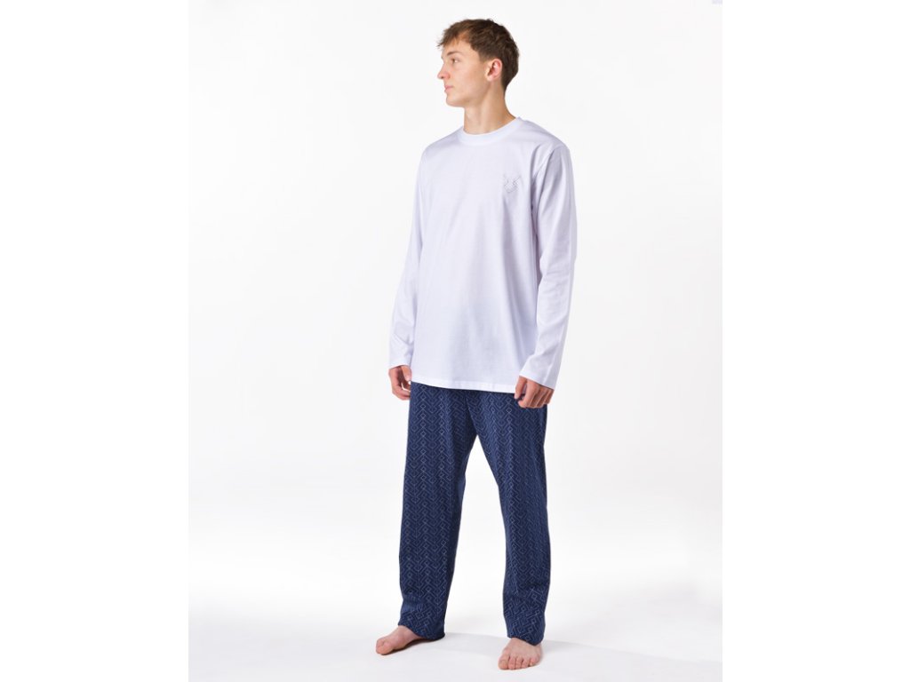 Pánské klasické pyžamo volného střihu z jemného úpletu Vám poskytne pohodlí během spánku. Kalhoty jsou potištěny drobným vzorem, triko s dlouhými rukávy zdobí menší potisk na hrudi.