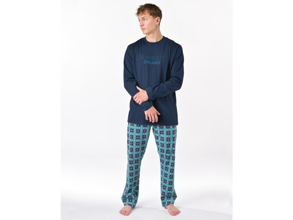 Pánské klasické pyžamo volného střihu z jemného úpletu Vám poskytne pohodlí během spánku. Kalhoty s výraznějším vzorem doplňuje triko s dlouhými rukávy a potiskem na hrudi.