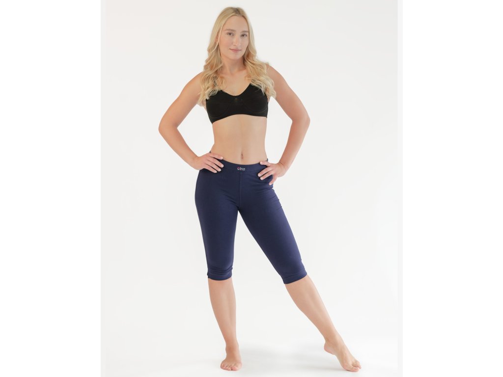 Capri kalhoty, dámské šité sportovní prádlo. V pasovém kraji je zašitá širší pruženka. Na pasovém kraji je umístěné logo, v nohavicích jsou u dolního kraje vypracovány krátké rozparky. Kalhoty jsou jednobarevné. Materiál je vyroben z bavlny, která je doplněna elastanem. Úplet je vhodný pro všechny, kteří hledají přírodní materiály. Elastan přidává materiálu pružnost a zlepšuje jeho tvarovou stálost. Prádlo z tohoto materiálu je vhodné pro každodenní nošení.